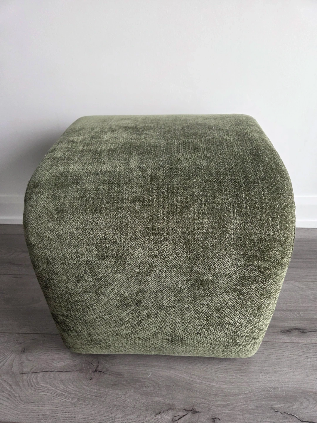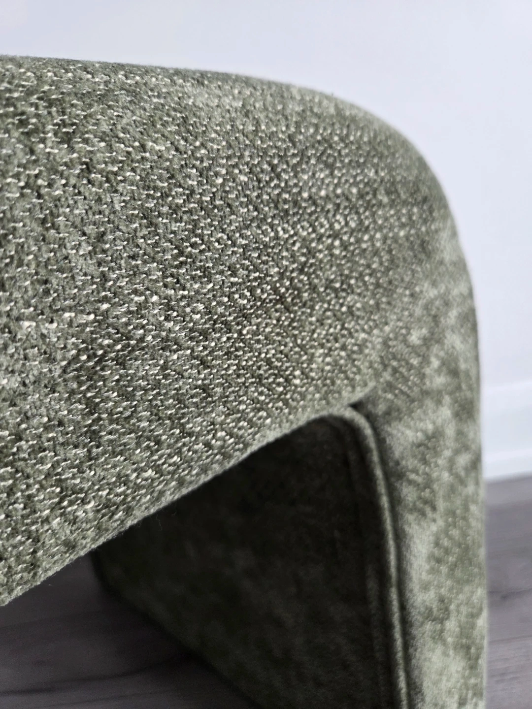 U-shaped ottomans upholstered in textured green fabric. They're great additions to small living spaces. Could be used for foot support or extra seating.