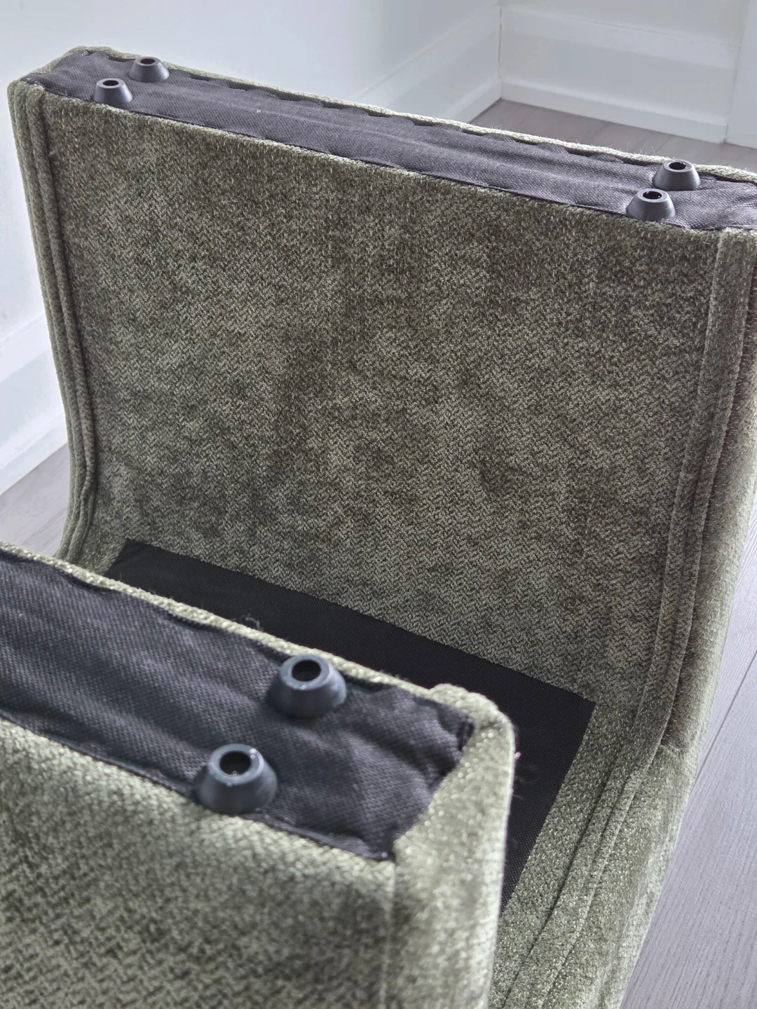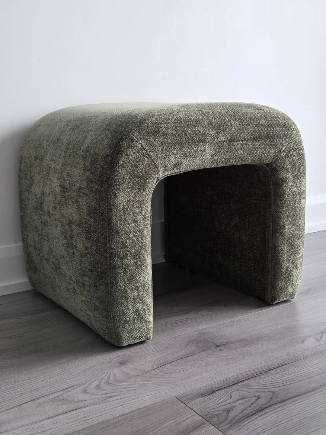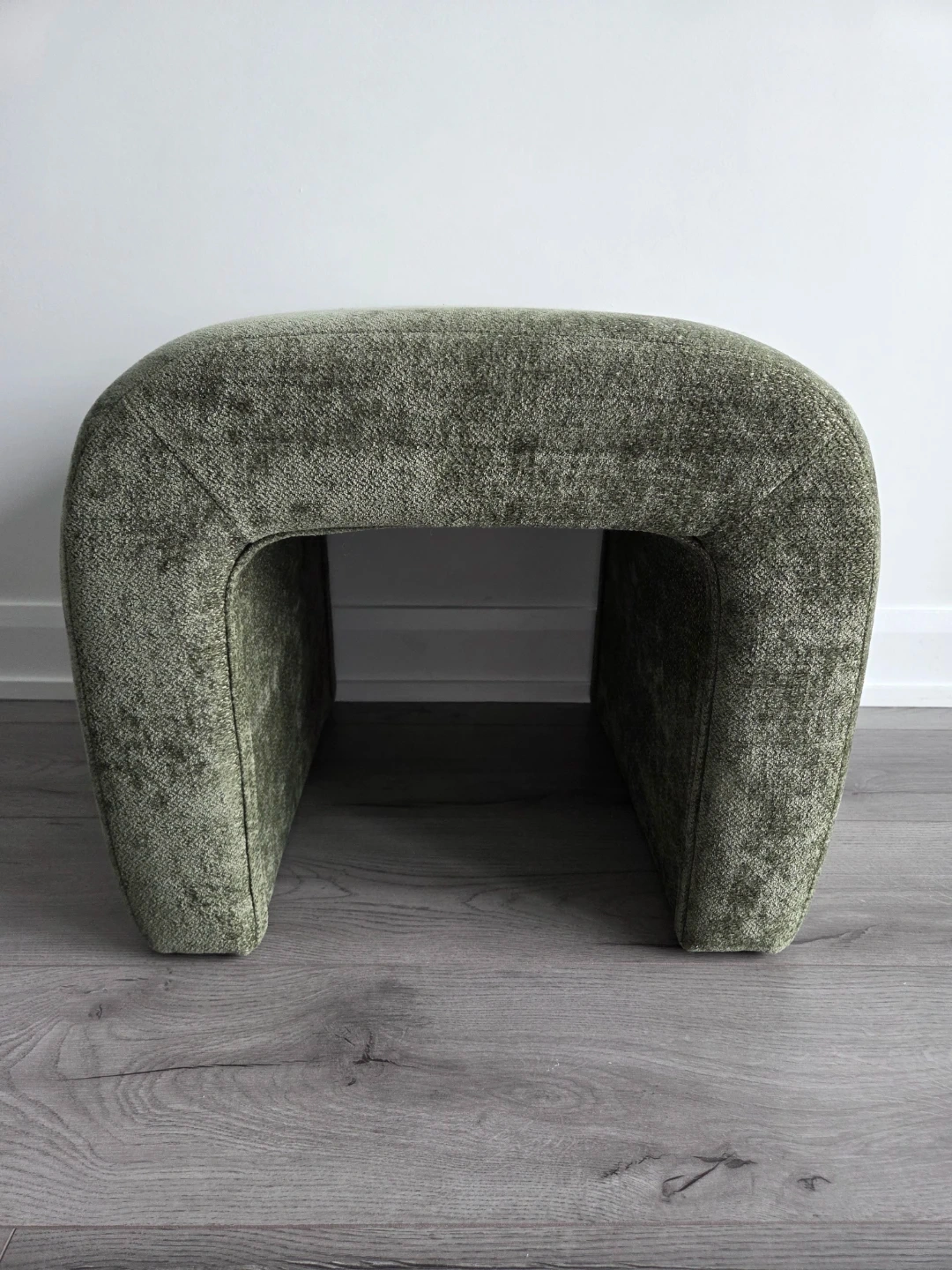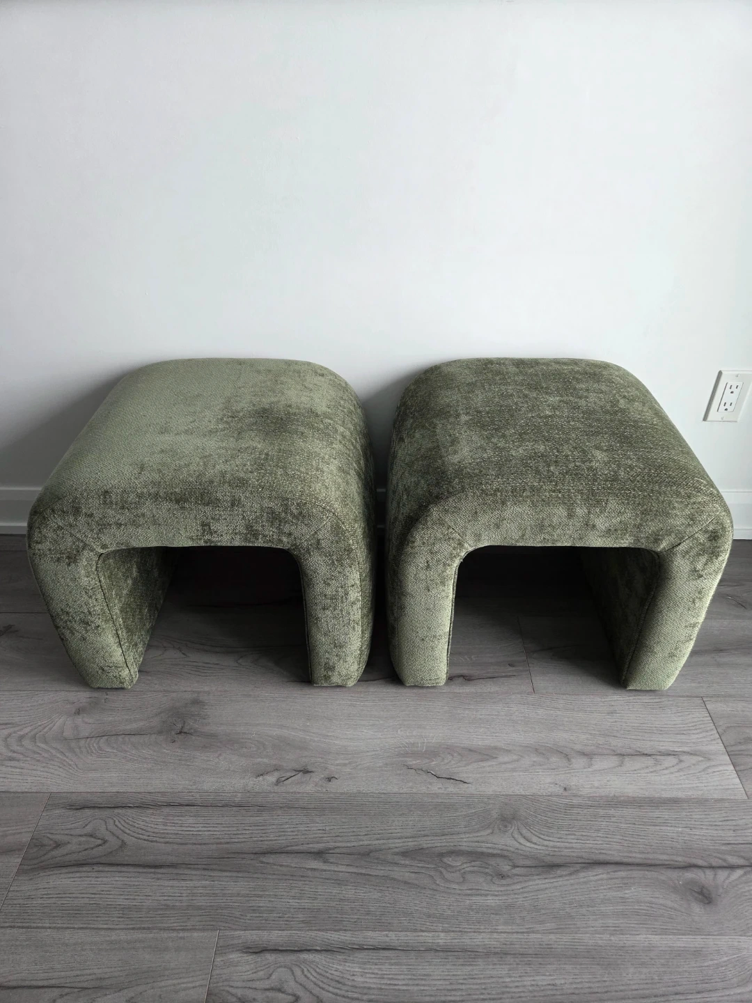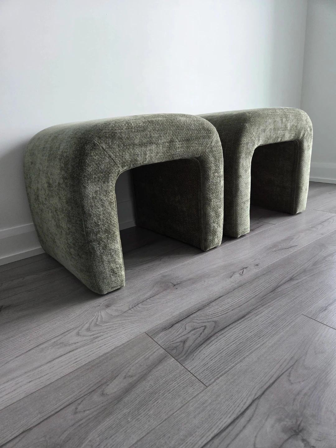U-shaped ottomans upholstered in textured green fabric. They're great additions to small living spaces. Could be used for foot support or extra seating.