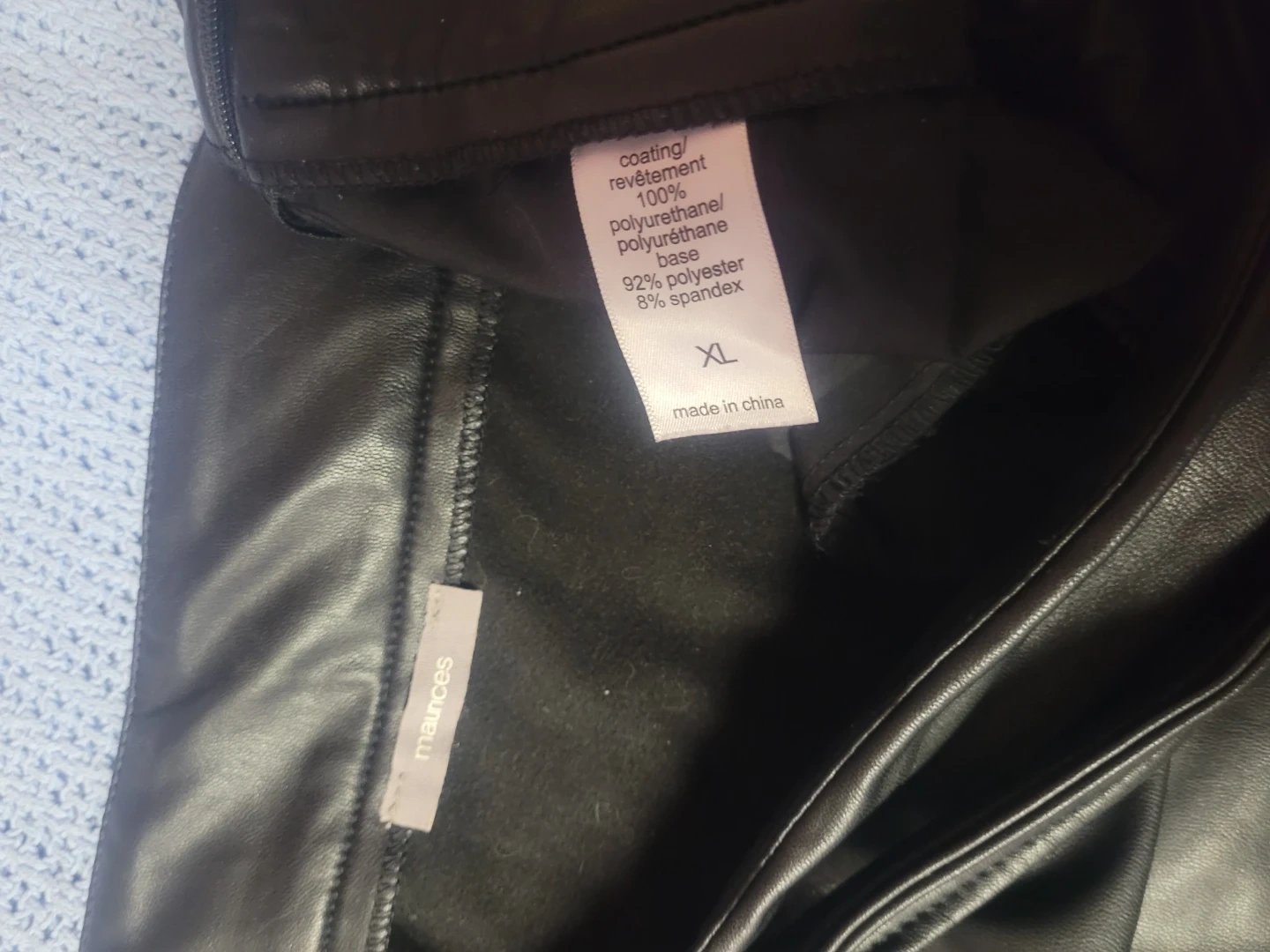 This is a black faux leather A-line skirt. It's made with a polyurethane coating and a polyester and spandex blend for comfort. It's a size XL. Great condition, no longer fits. Ir has been folded in a drawer.