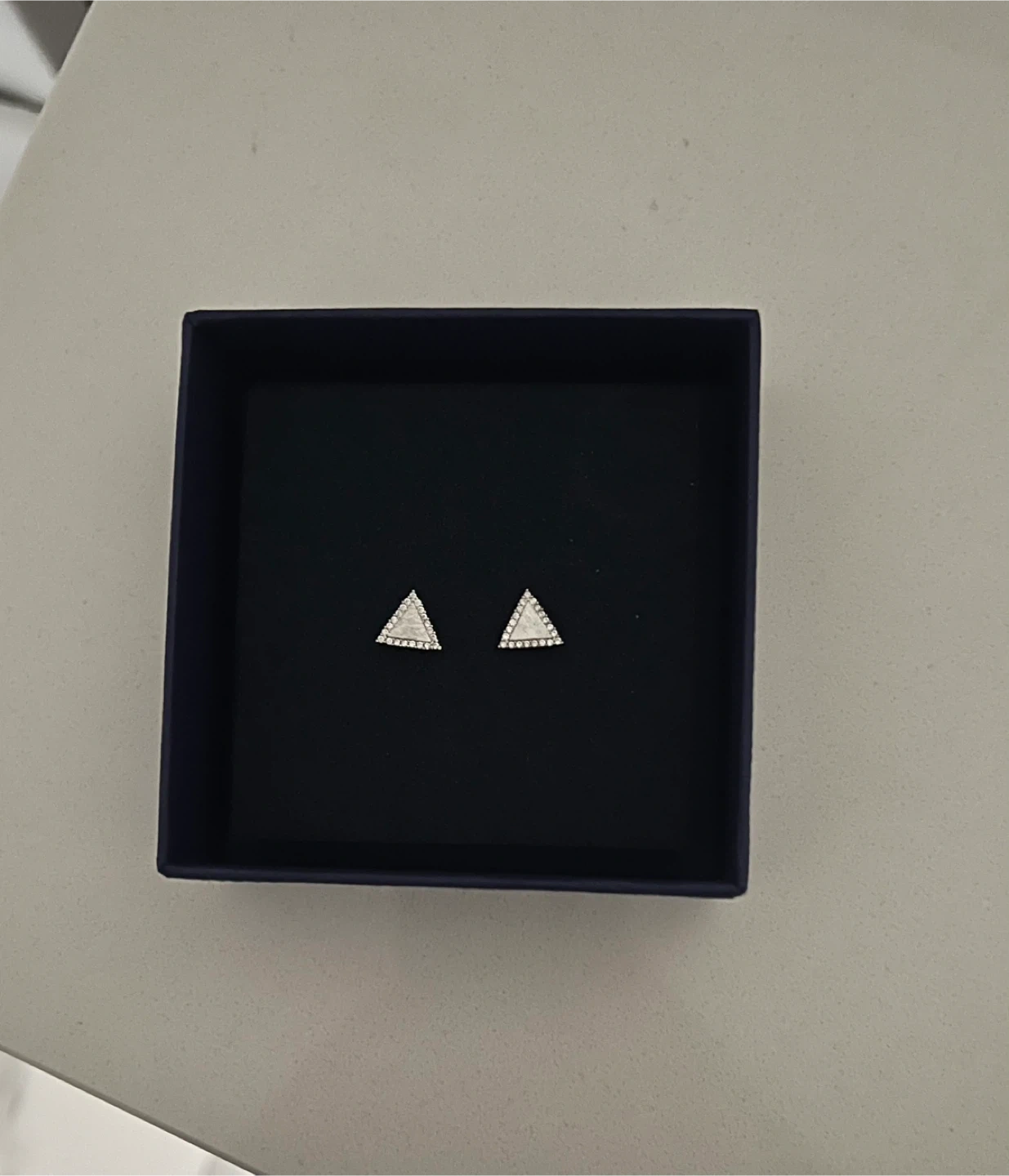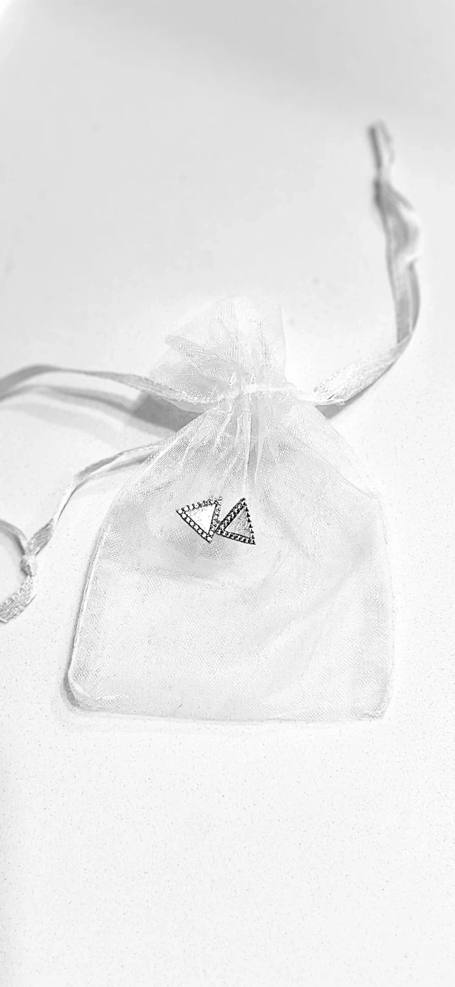 A pair of stylish triangle stud earrings adorned with sparkling Cubic Zirconia. They're crafted from a silver-toned metal and come in a gift pouch. These earrings add a subtle shimmer to any outfit! Virtually brand new.