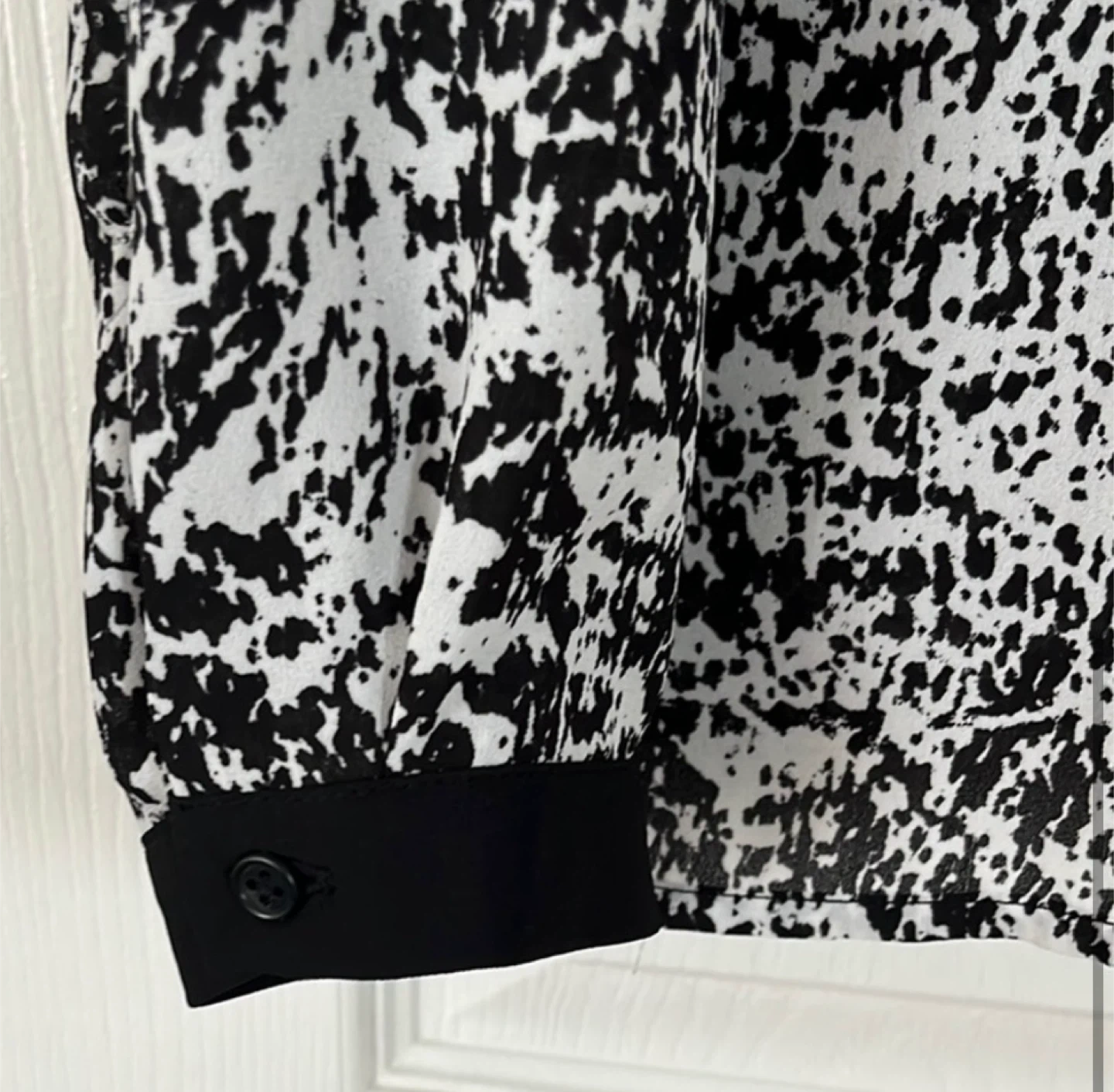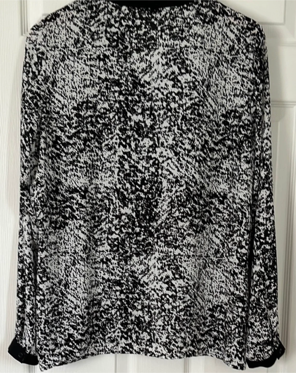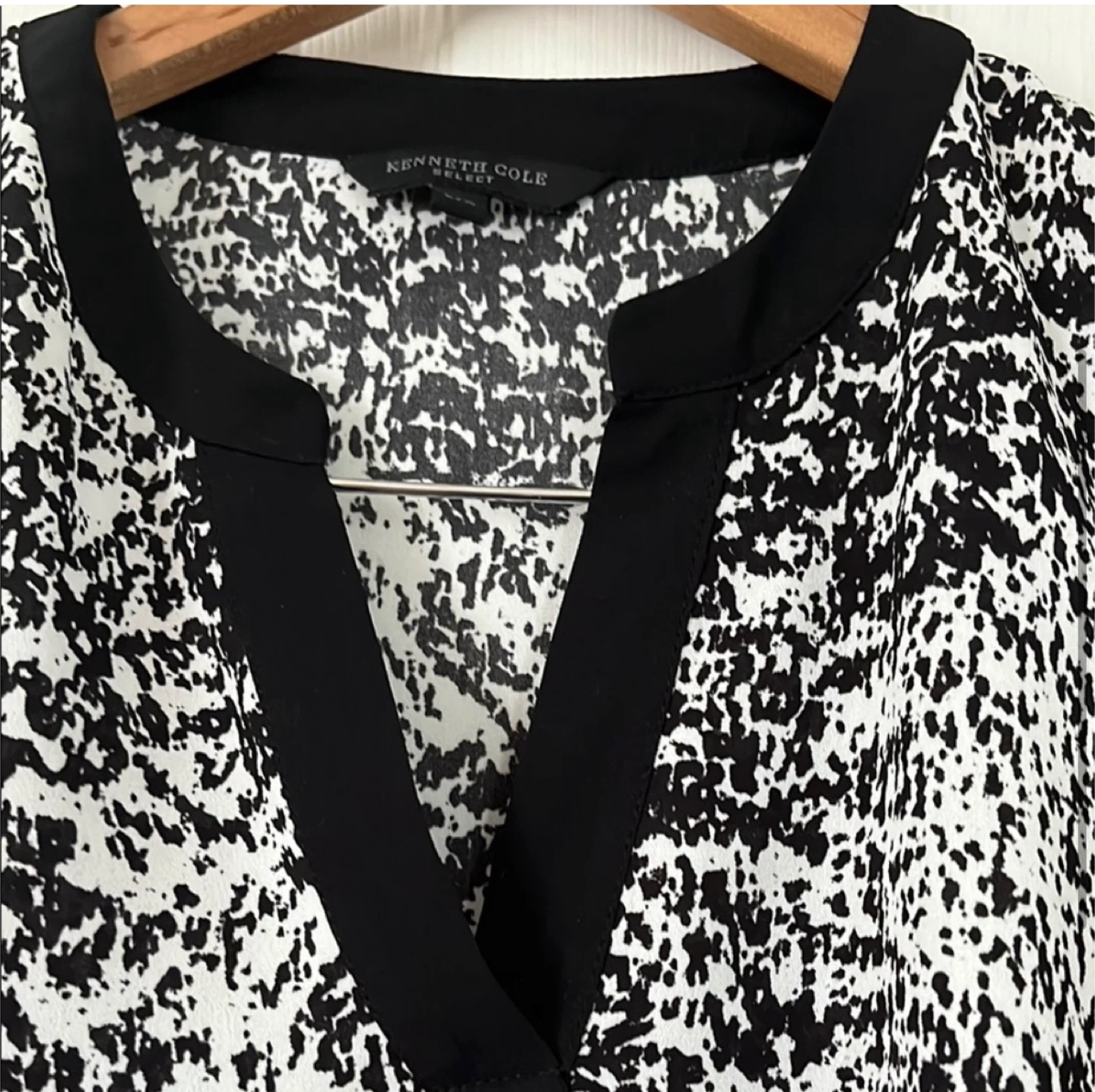 Selling a Kenneth Cole Select blouse in size L. The blouse features a black and white pattern and has a V-neck design with long sleeves. It's in great condition and ready for a new wardrobe!