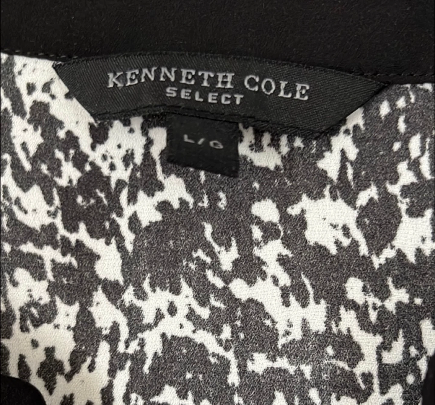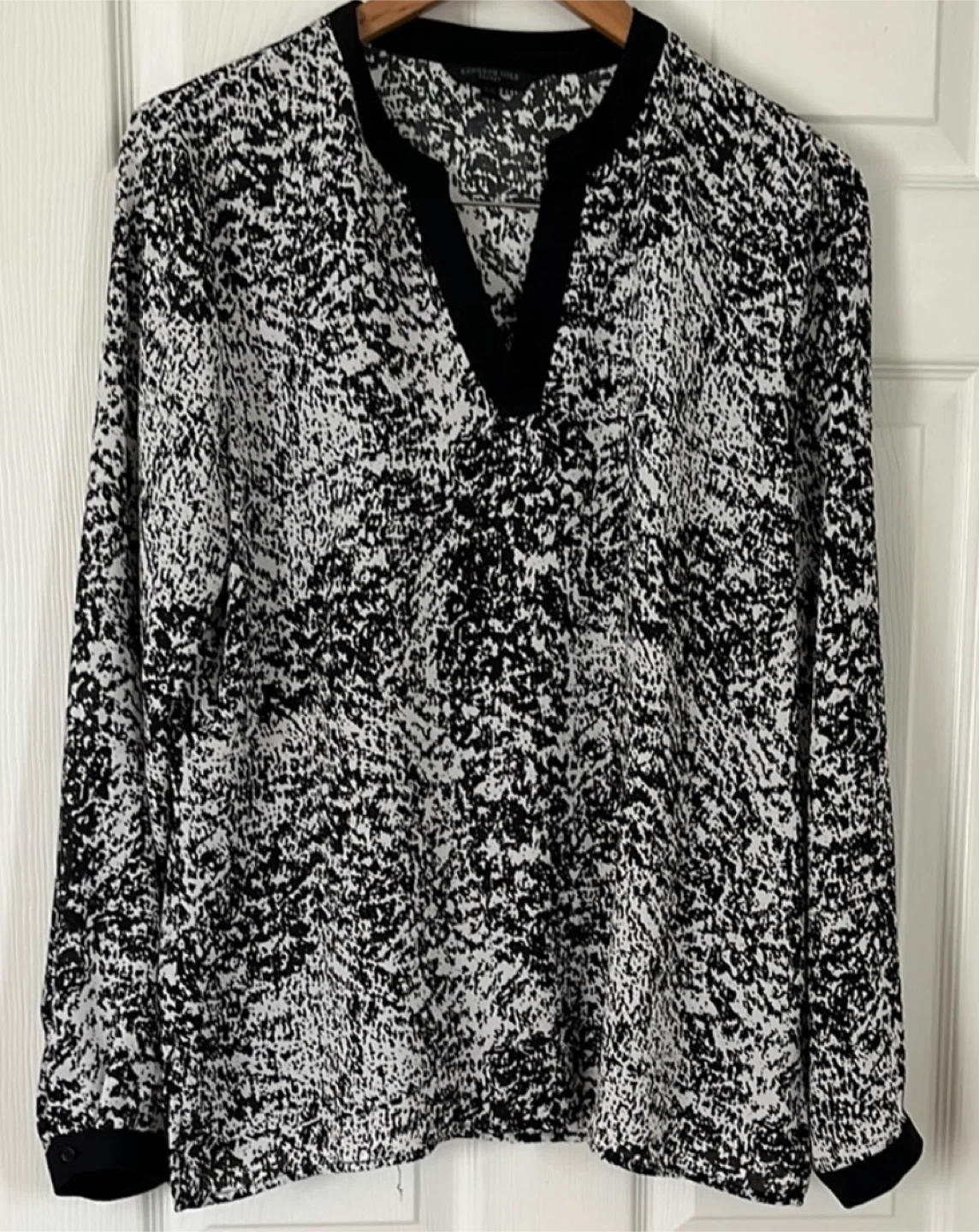Selling a Kenneth Cole Select blouse in size L. The blouse features a black and white pattern and has a V-neck design with long sleeves. It's in great condition and ready for a new wardrobe!