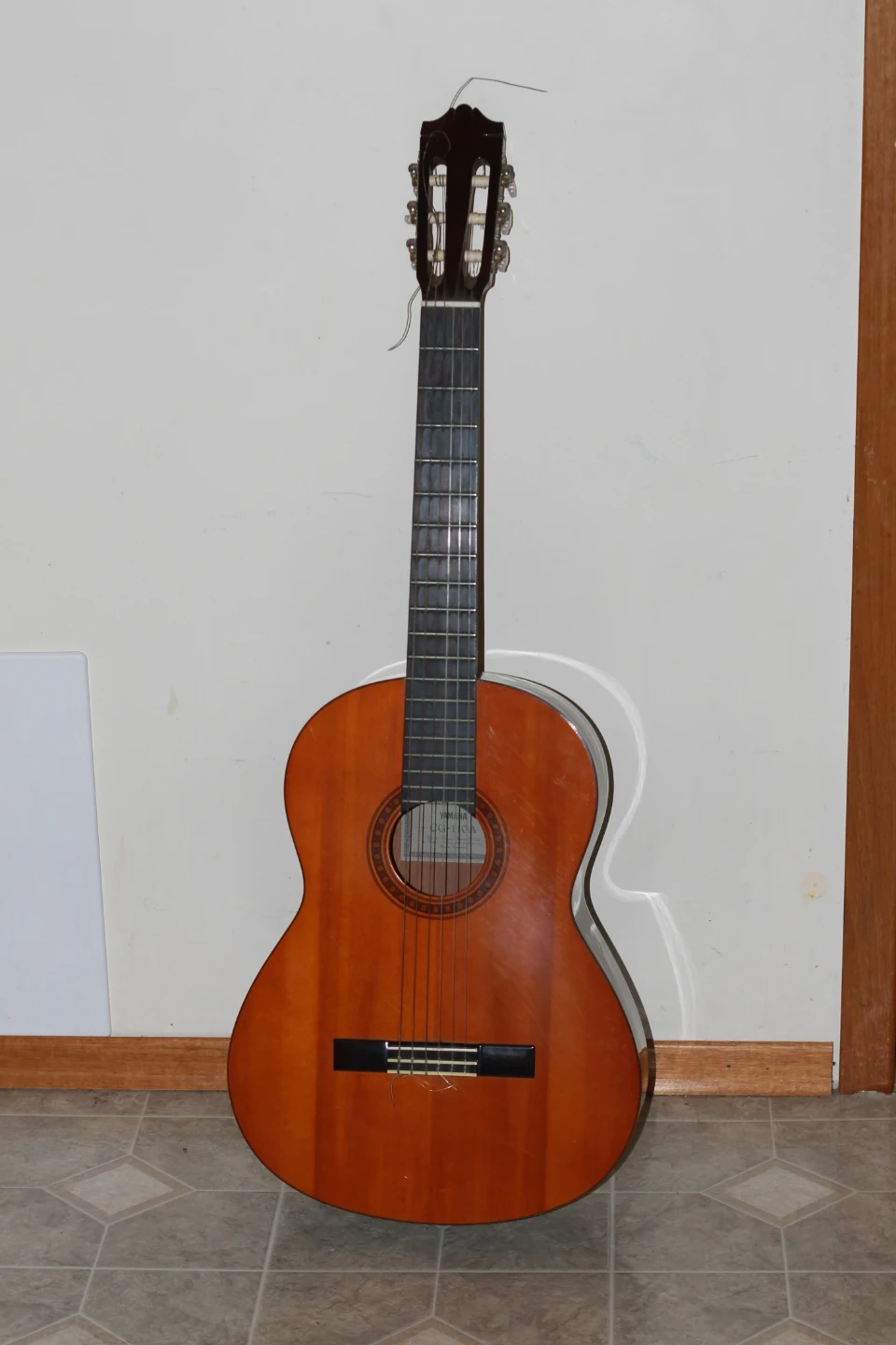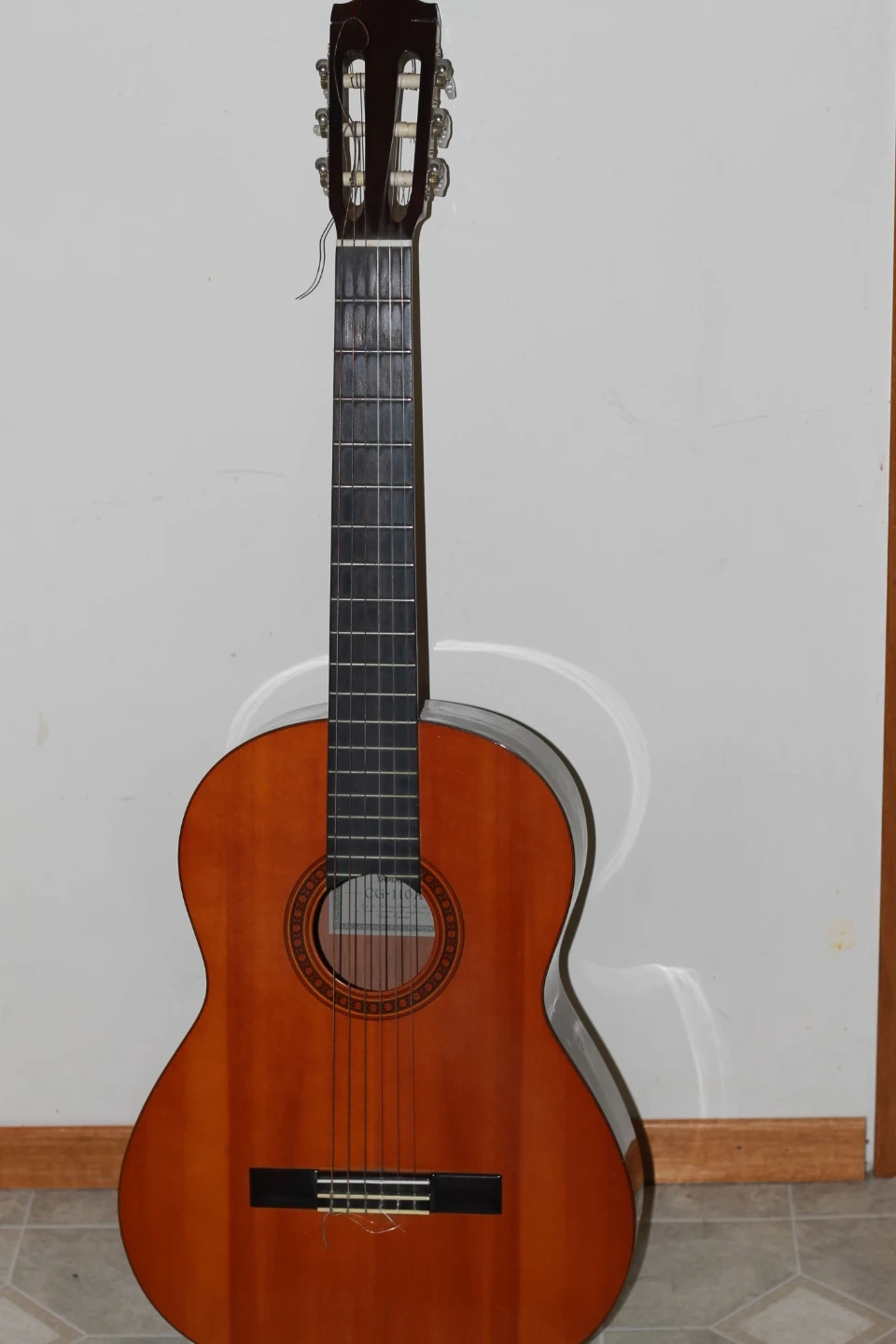 A Yamaha classical guitar in near mint condition. It includes a hardshell case, a tuning clamp, pick, and 3 new extra nylon strings. This instrument is perfect for beginner musicians looking to learn classical guitar.