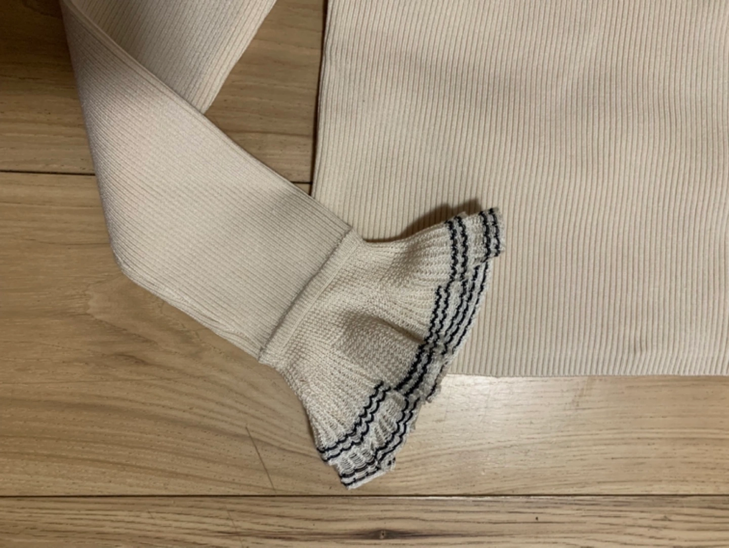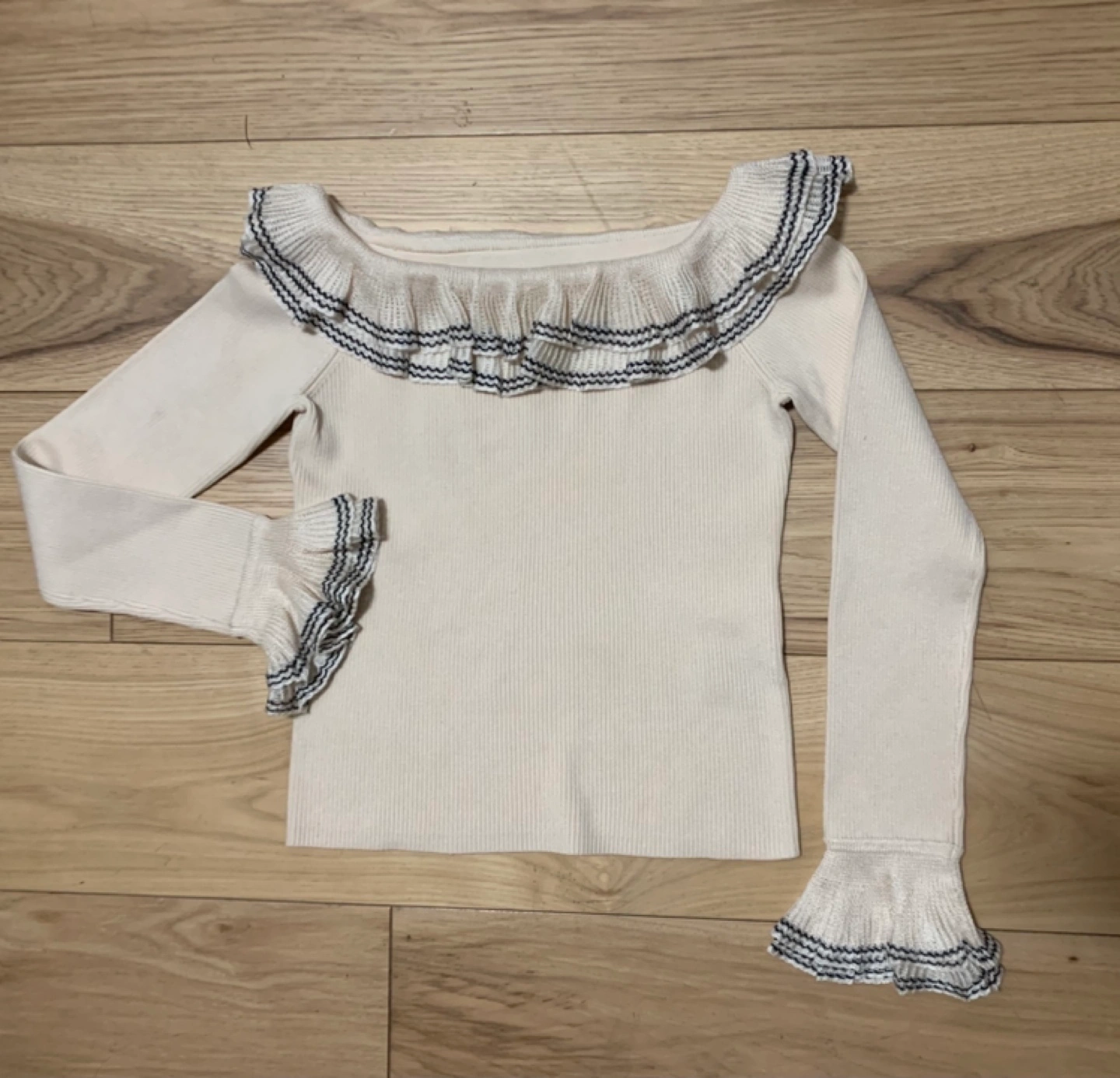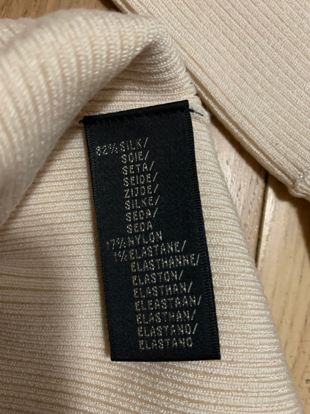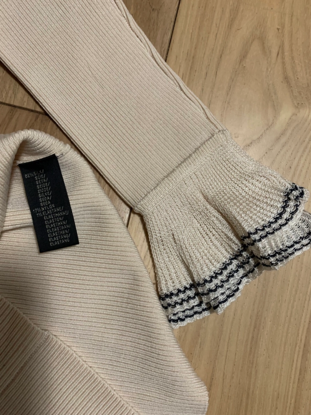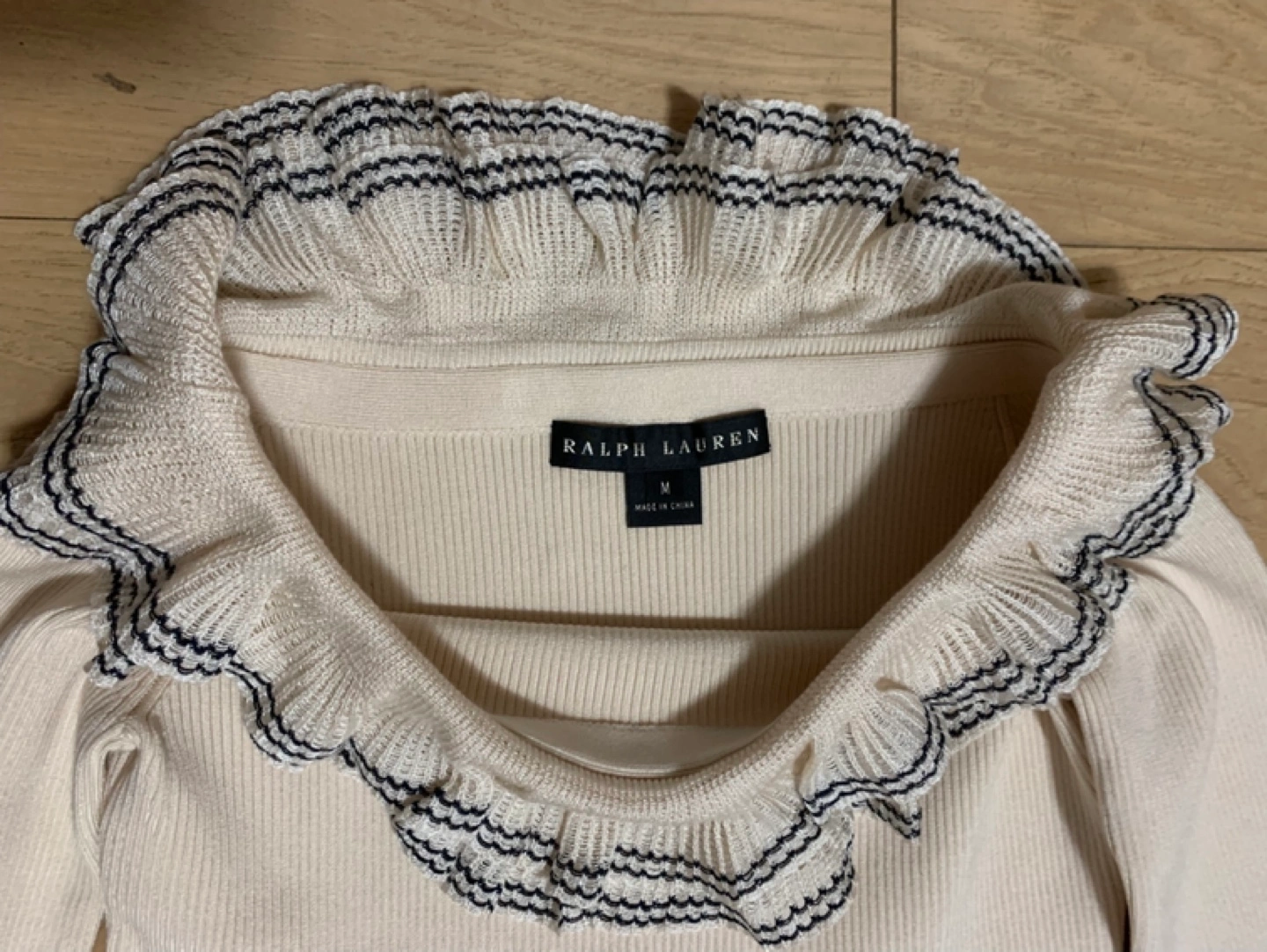Brand new, never worn Ralph Lauren cream-coloured ribbed knit top. Features ruffled neckline and cuffs. Long sleeves. Size Medium. 82% silk, 17% elastane.
