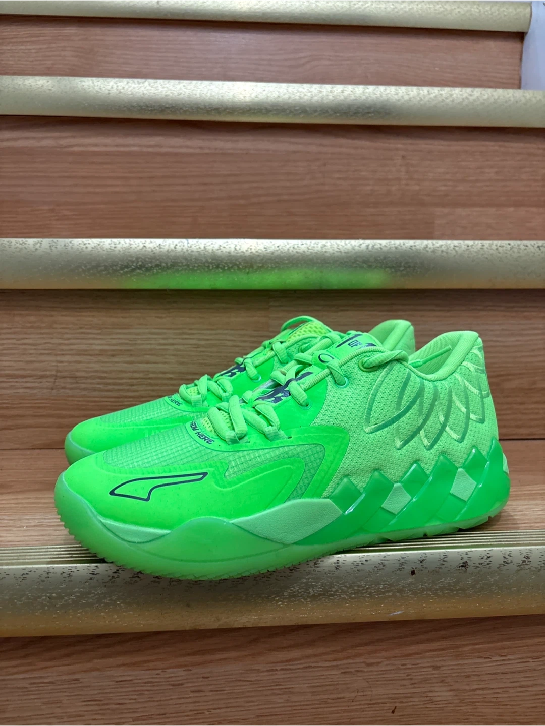Puma MB.01 "Not From Here" basketball shoes in a vibrant neon green colour.