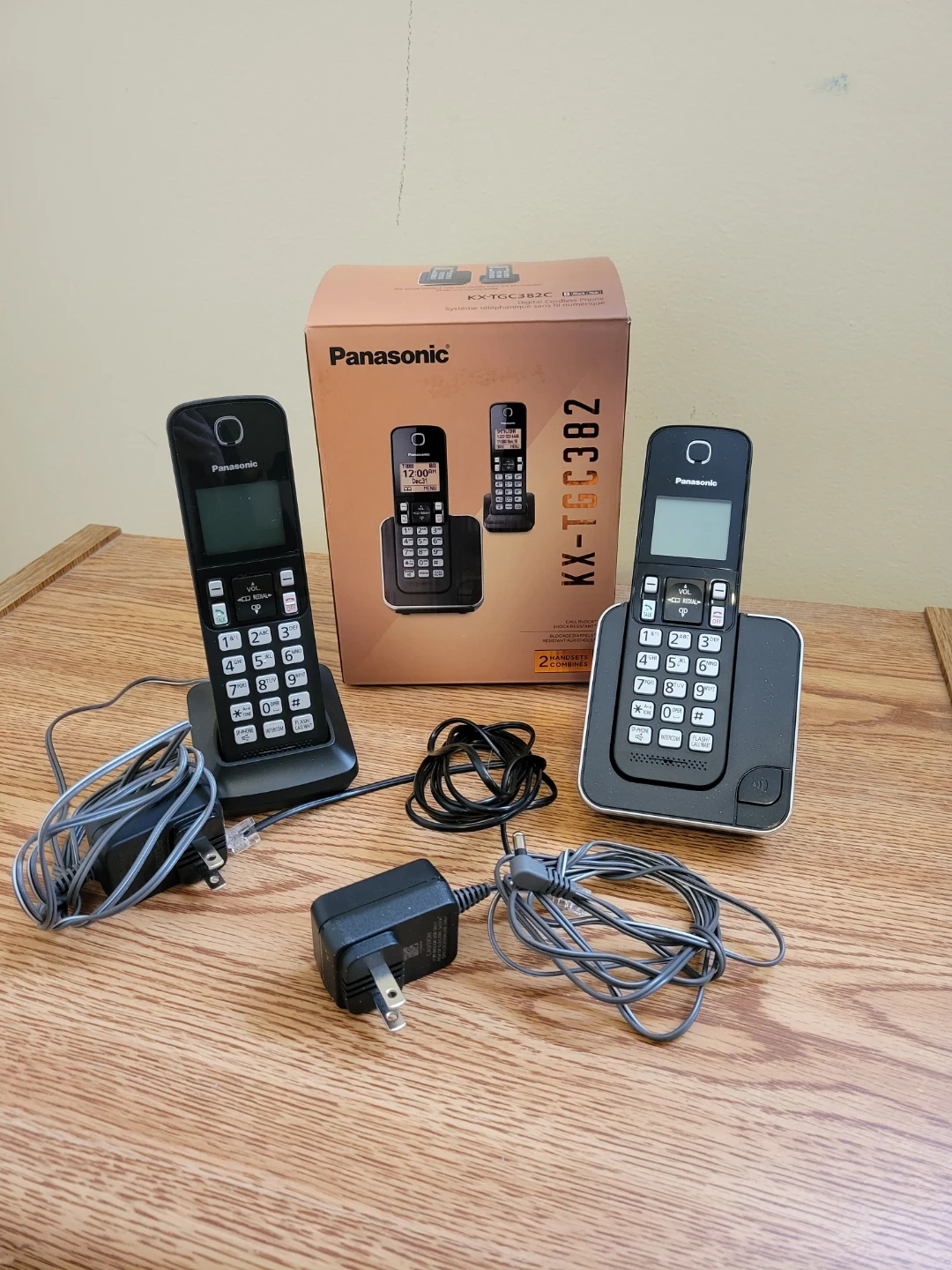 This is a Panasonic KX-TGC382C cordless phone system. It includes two black handsets, two charging bases, and two power adapters.