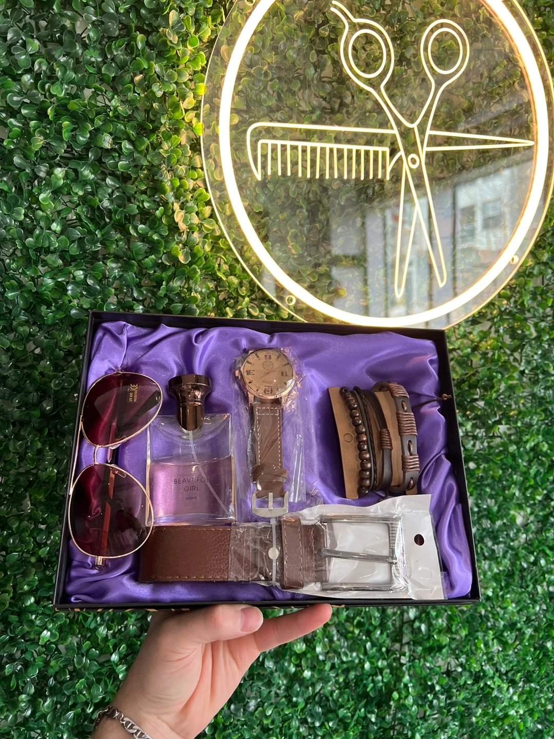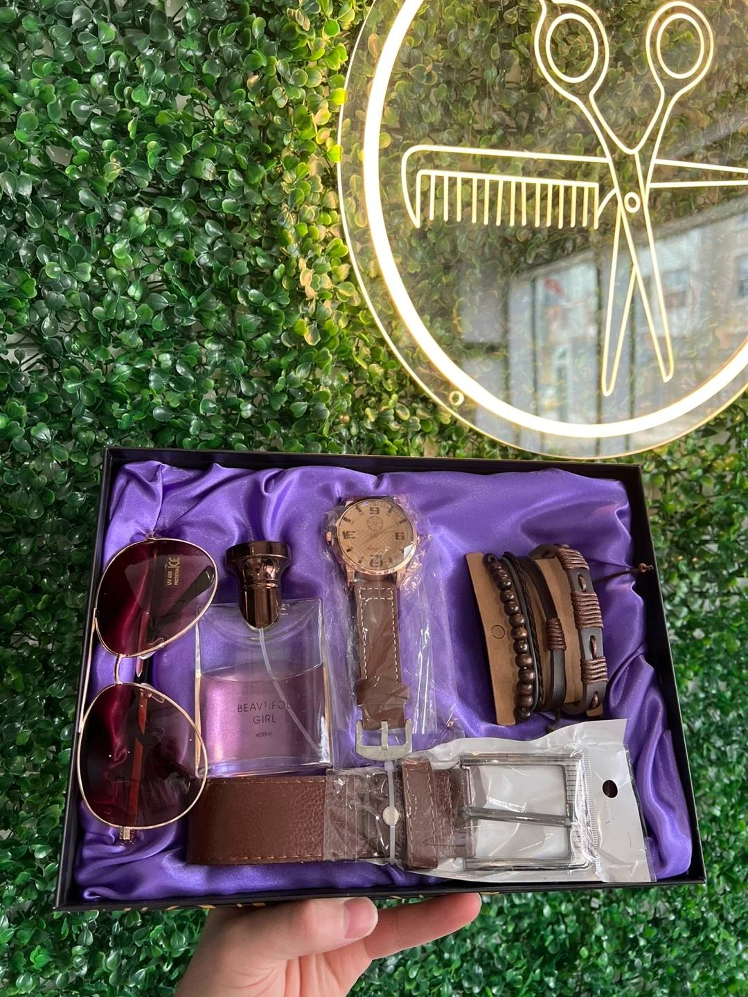 This gift set includes a stylish watch, a pair of sunglasses, a leather belt, a fragrance bottle, and braided bracelets. All items come neatly arranged in a presentation box, making it a complete package for gifting.
