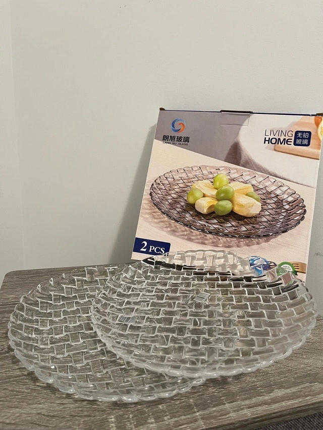 Large round crystal glass serving plates with a beautiful weave design. Set of 2. Each plate measures 10" (25.5 cm). These are brand new and still have their original stickers!