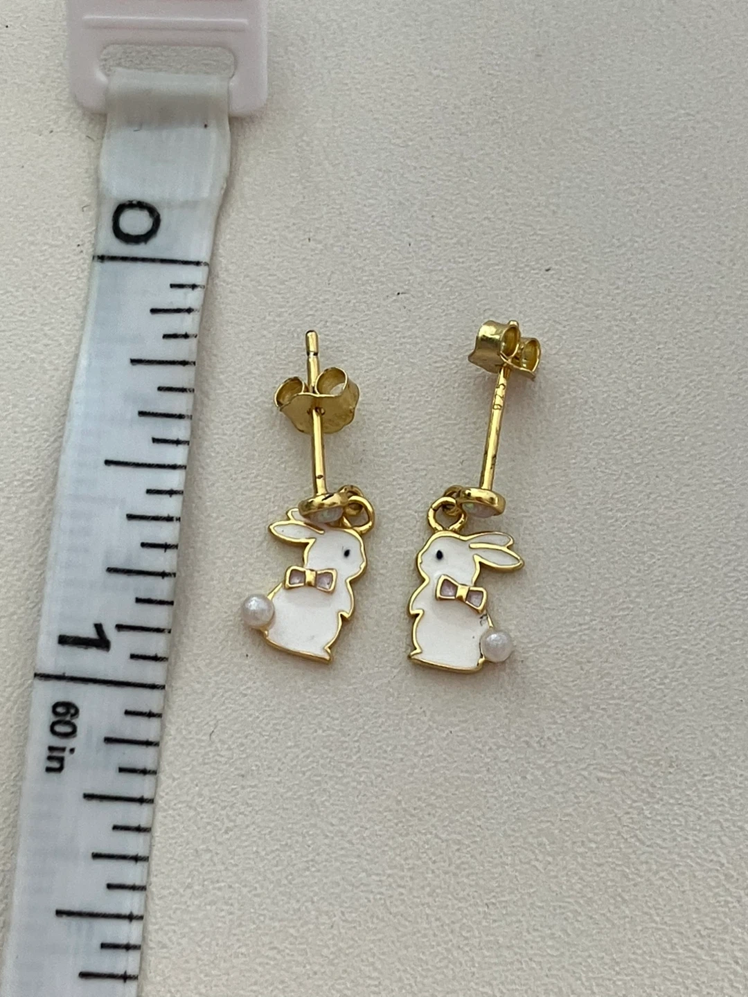 Adorable gold-tone bunny earrings with white enamel and small pearl accents. They're designed with a pink bow tie detail. Perfect for adding a touch of fun to any outfit!