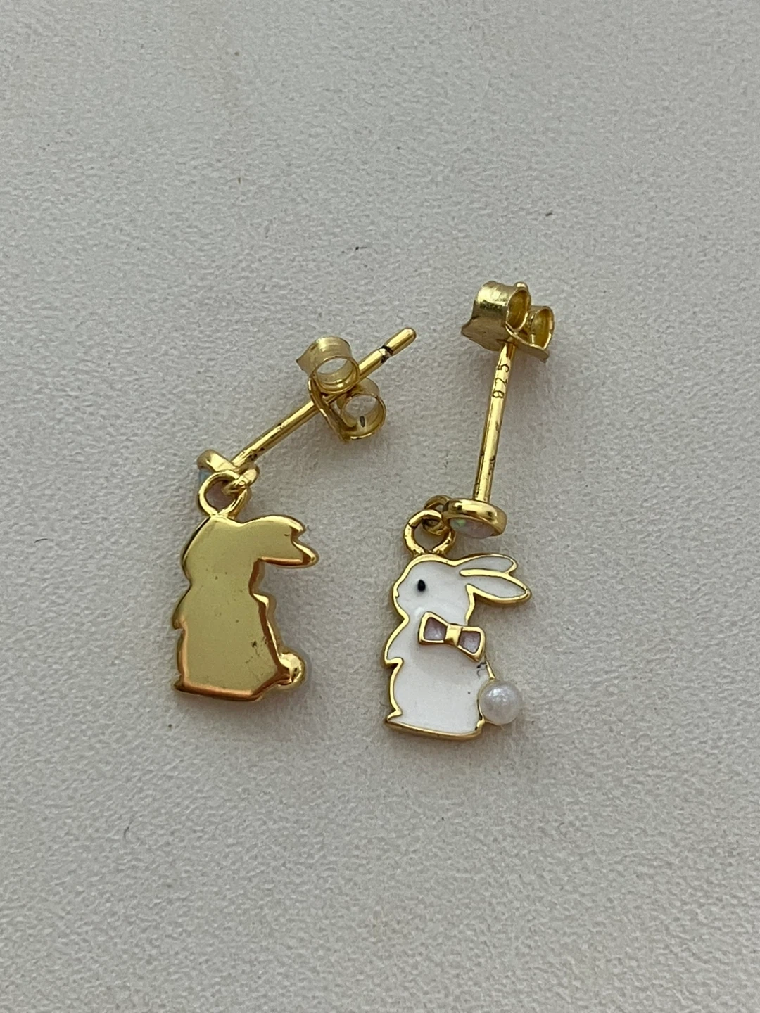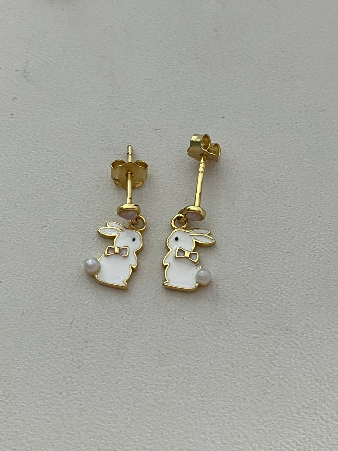 Adorable gold-tone bunny earrings with white enamel and small pearl accents. They're designed with a pink bow tie detail. Perfect for adding a touch of fun to any outfit!