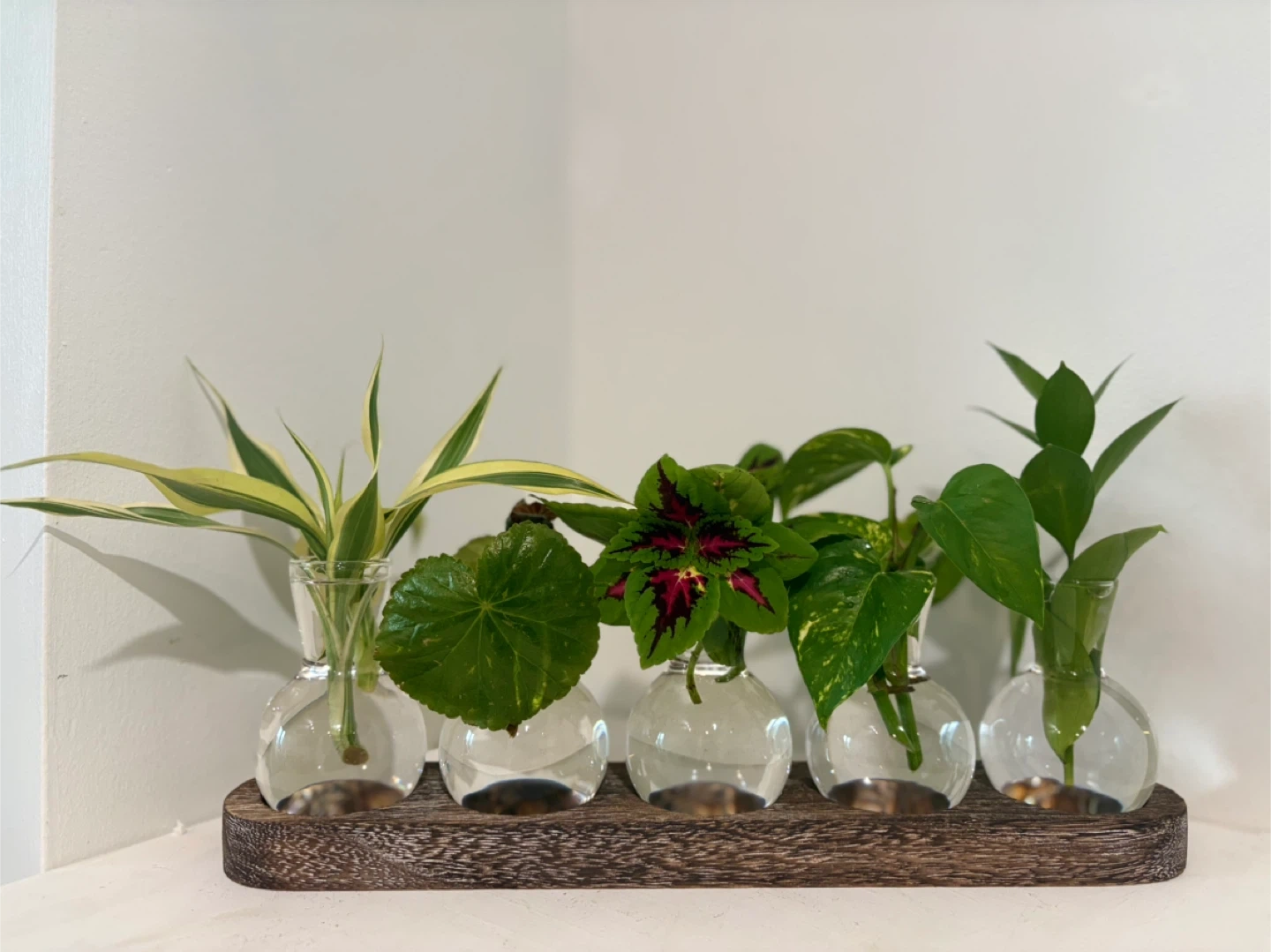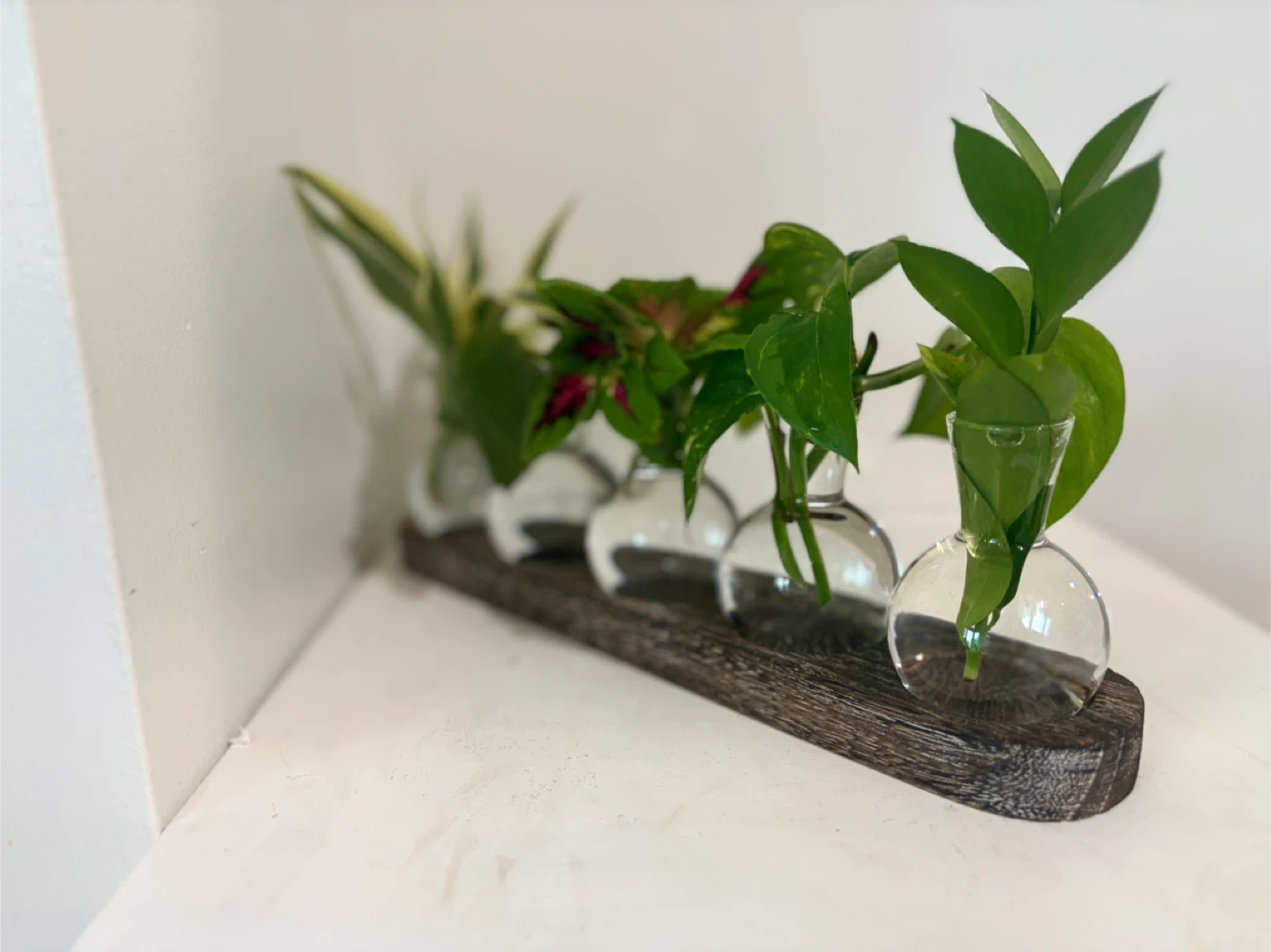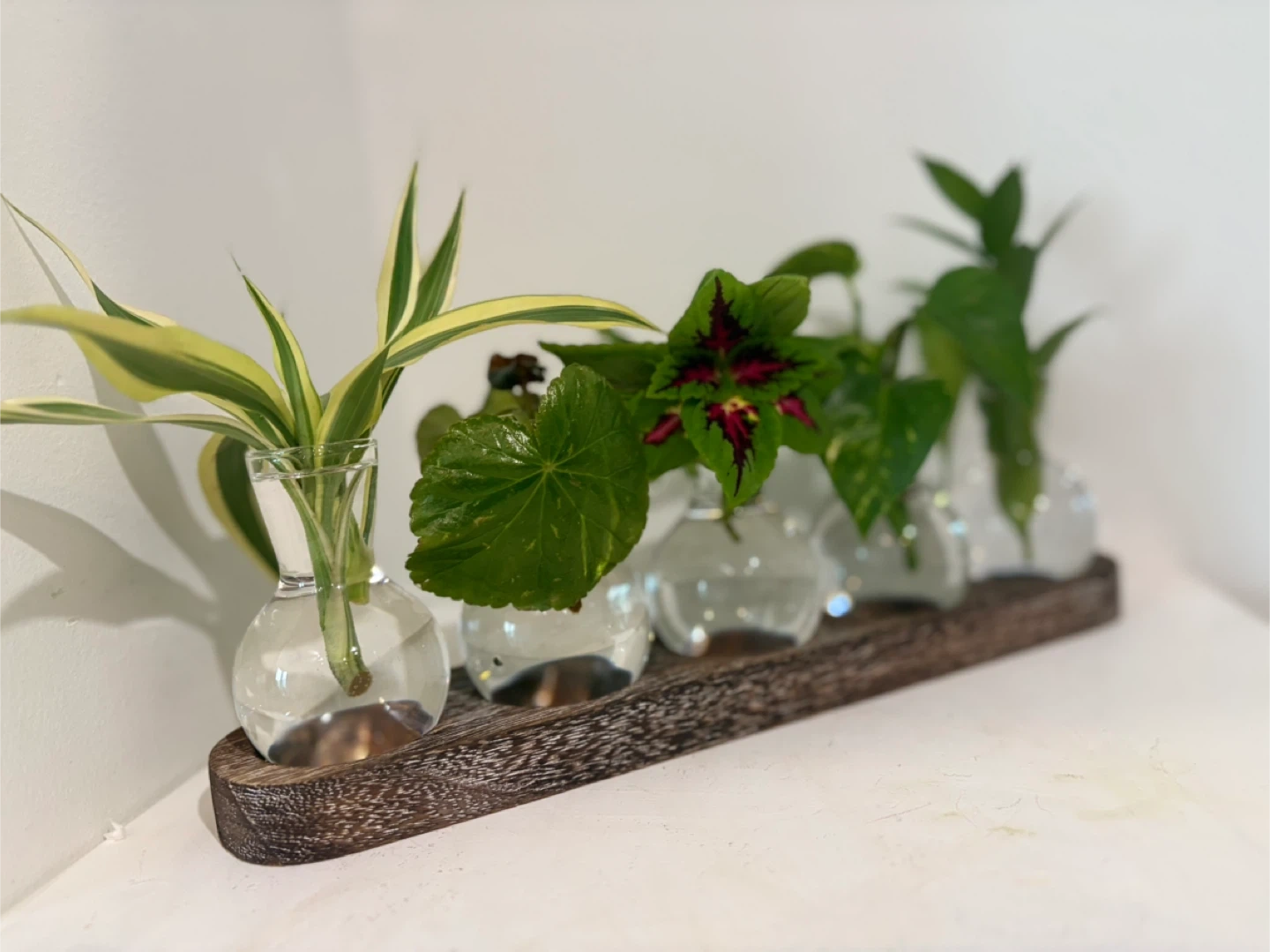 Set of five glass bud vases with a dark wooden base. Each vase is round and designed for rooting plant cuttings. This setup is great for starting new plants or displaying small cuttings!
