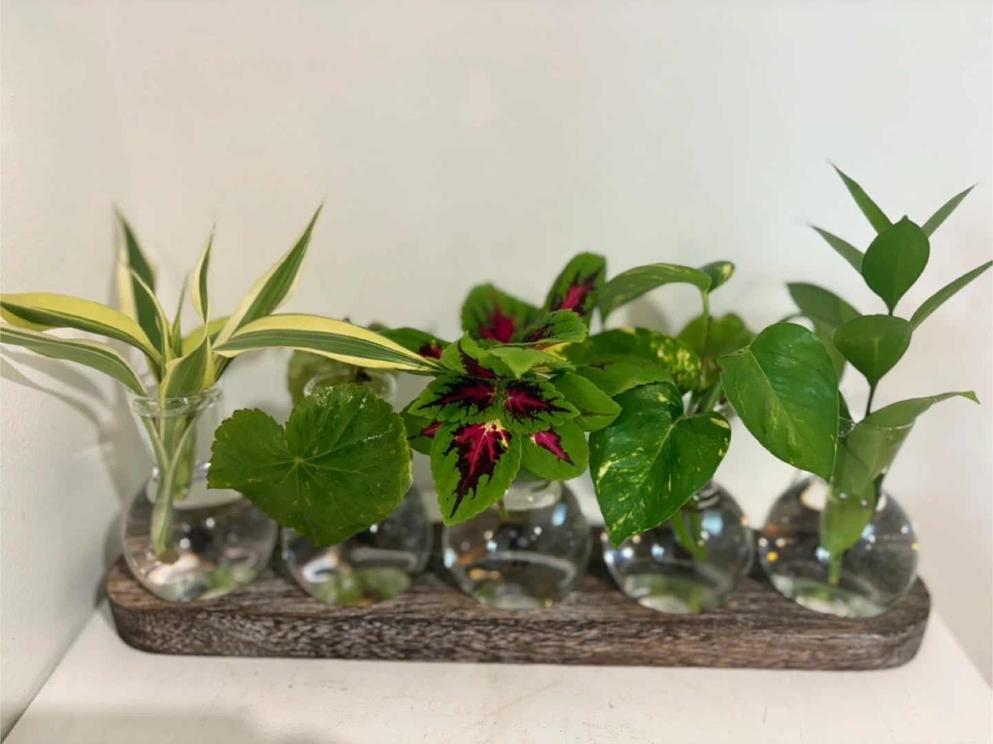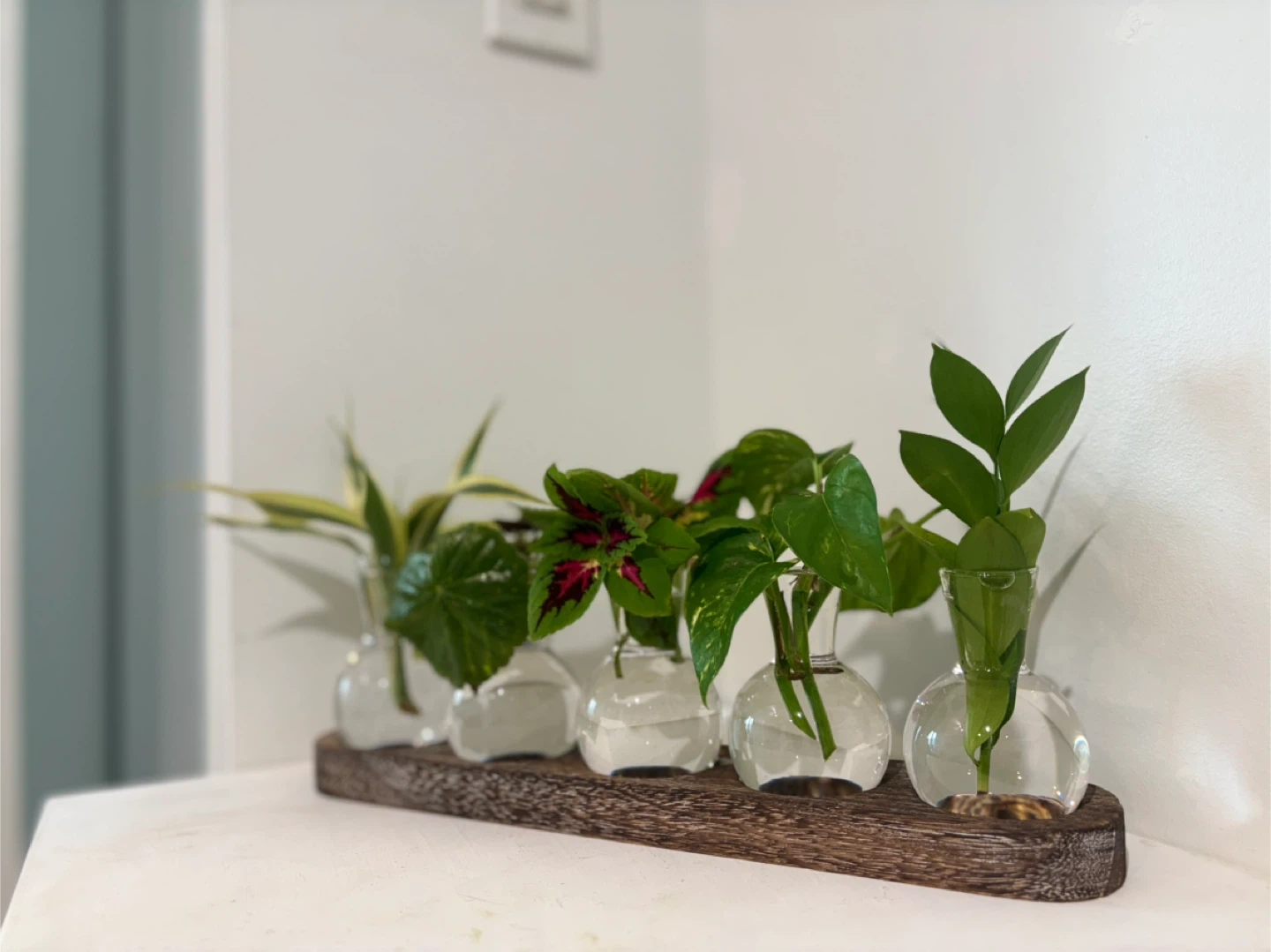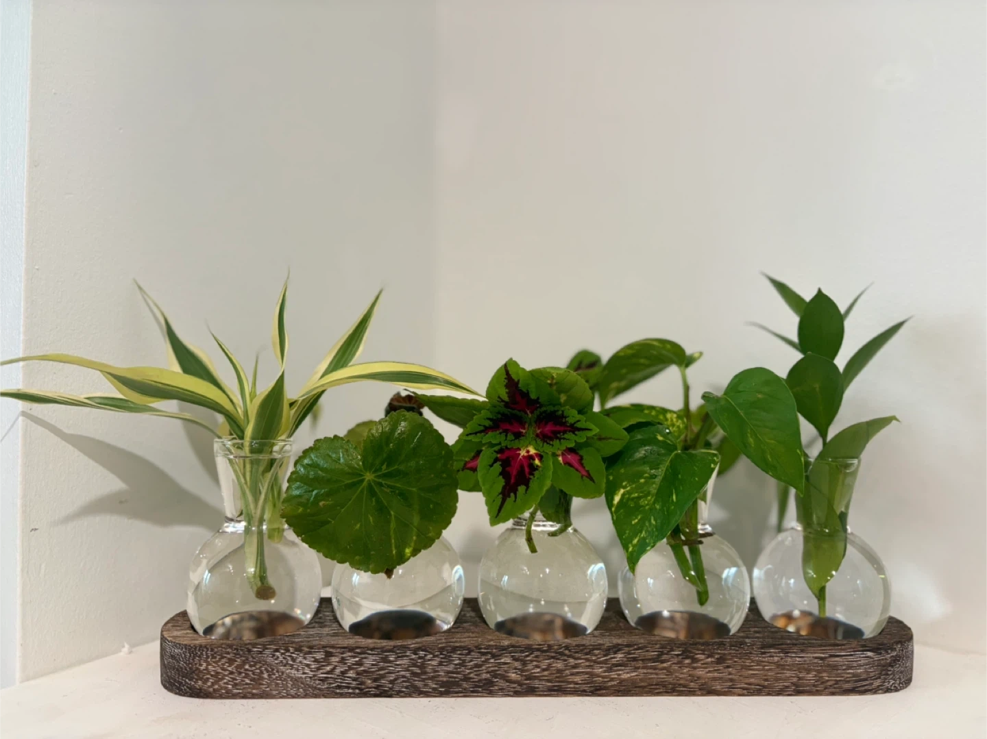 Set of five glass bud vases with a dark wooden base. Each vase is round and designed for rooting plant cuttings. This setup is great for starting new plants or displaying small cuttings!