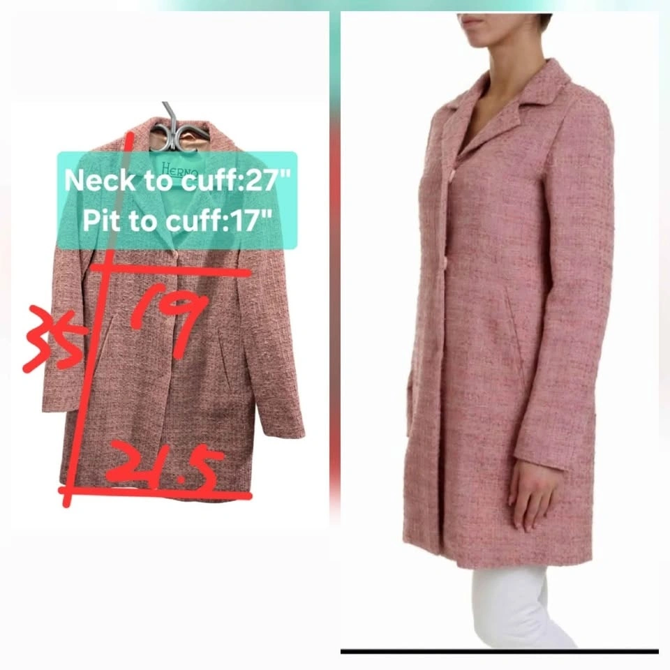 Herno size 42 is equal to US size 6. Condition 8.5/10. No visible flaws, but some wrinkles and minor general wear from being worn. Shell: Cotton/viscose/polyamide blend. Lining: Acetate/polyester blend. Lightweight tweed coat for spring to fall. Concealed snap button closure. Two side pockets. Lurex detailing. Knee-length. Original Retail Price: CAD 1700 including taxes. Pick Up: North York Finch Subway Station or near downtown subway line.