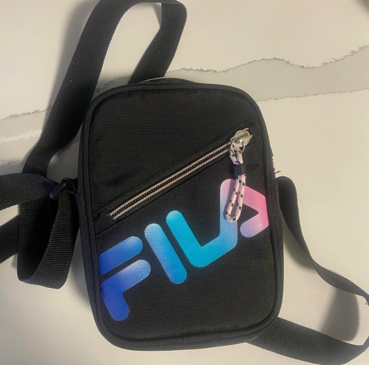 Stylish black Fila crossbody bag in great condition! Perfect for carrying your essentials on the go. It features the Fila logo in a cool gradient design.