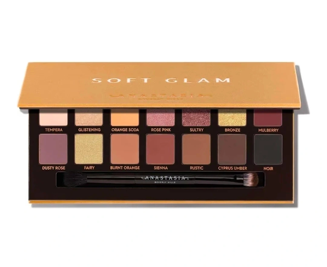 Anastasia Beverly Hills Soft Glam Eyeshadow Palette. This palette has 14 shades. It includes a dual-ended brush. The shades offer a mix of matte and metallic finishes.