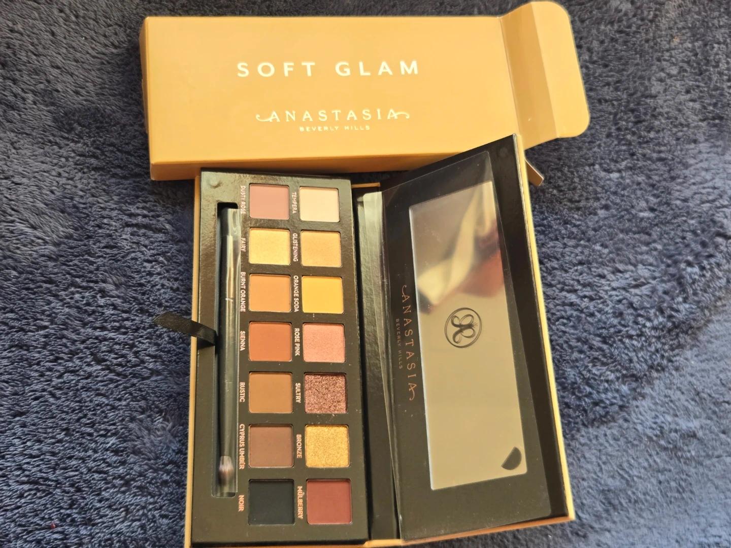 Anastasia Beverly Hills Soft Glam Eyeshadow Palette. This palette has 14 shades. It includes a dual-ended brush. The shades offer a mix of matte and metallic finishes.