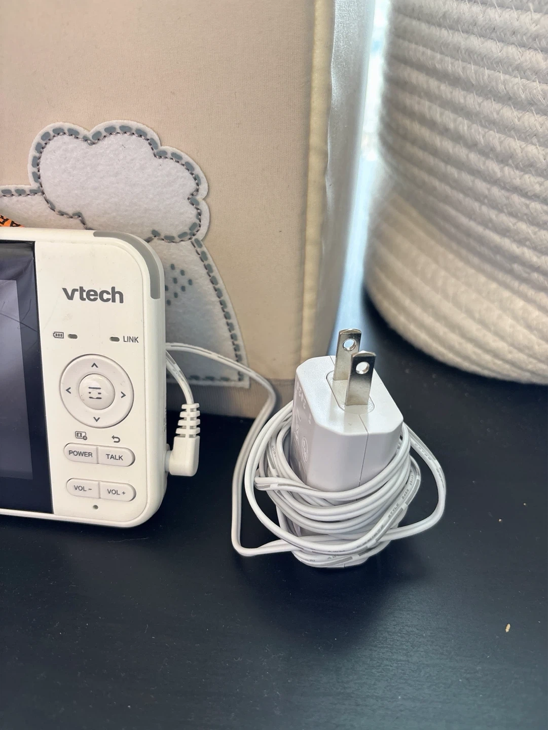 VTech VM321 video baby monitor set. Includes camera, parent unit, and power adapter. White colour.
