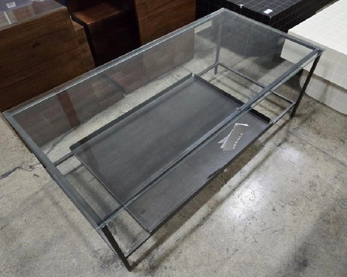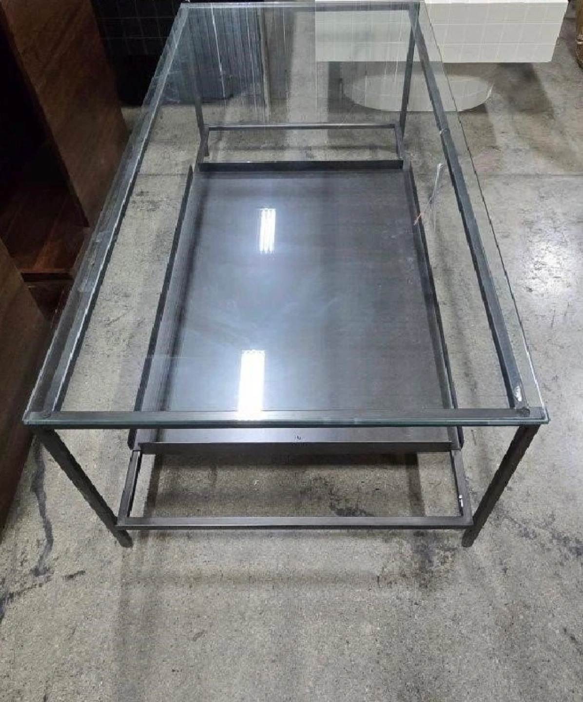Glass top and slim brushed gunmetal gray steel frame. Lower shelf provides storage.