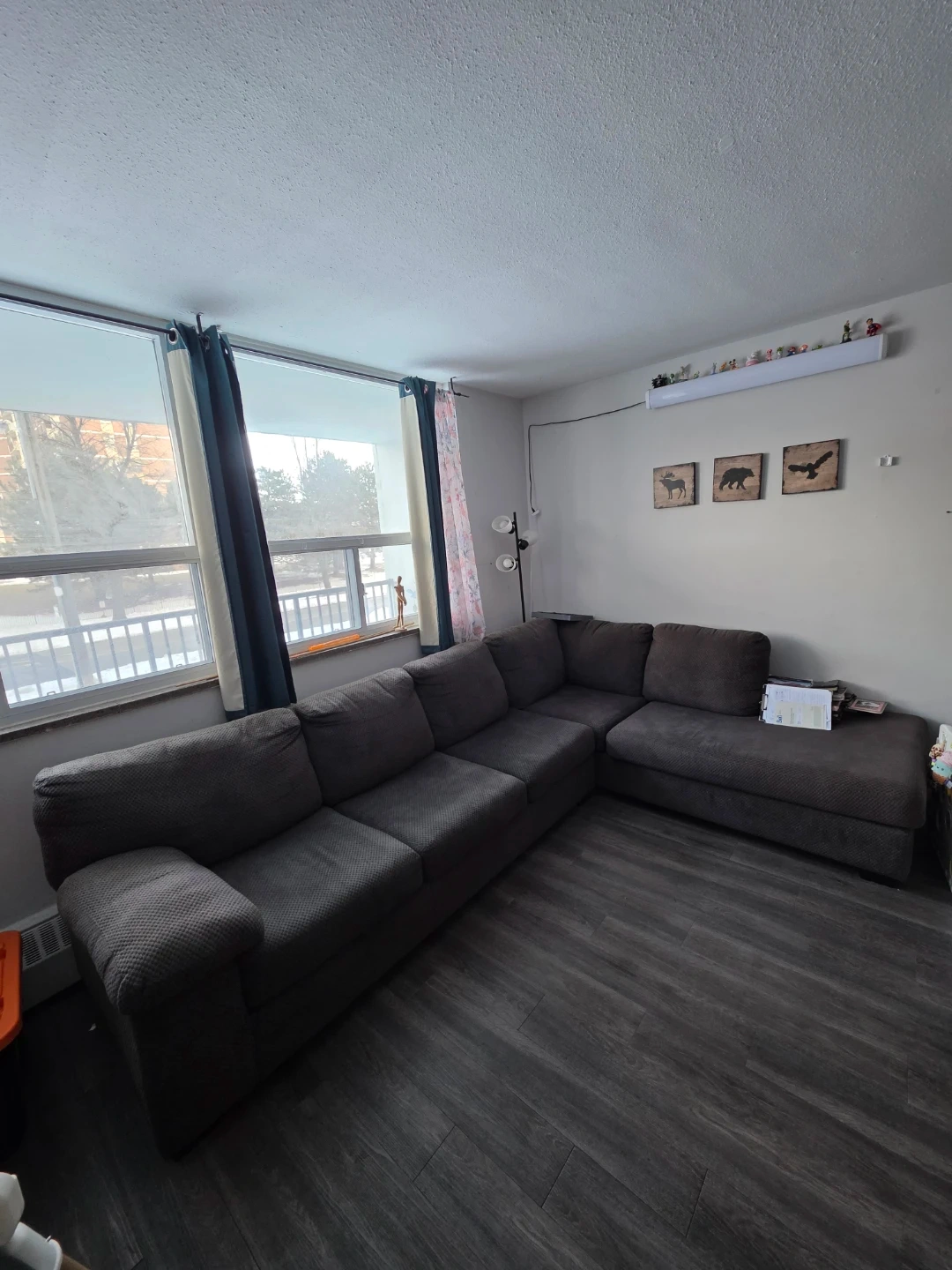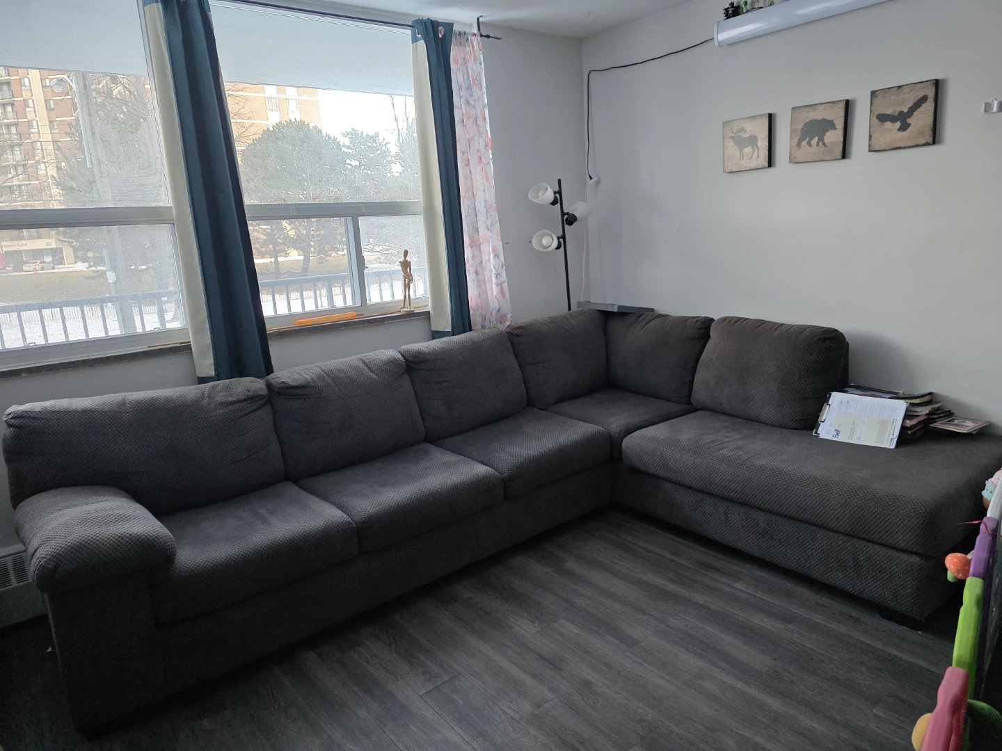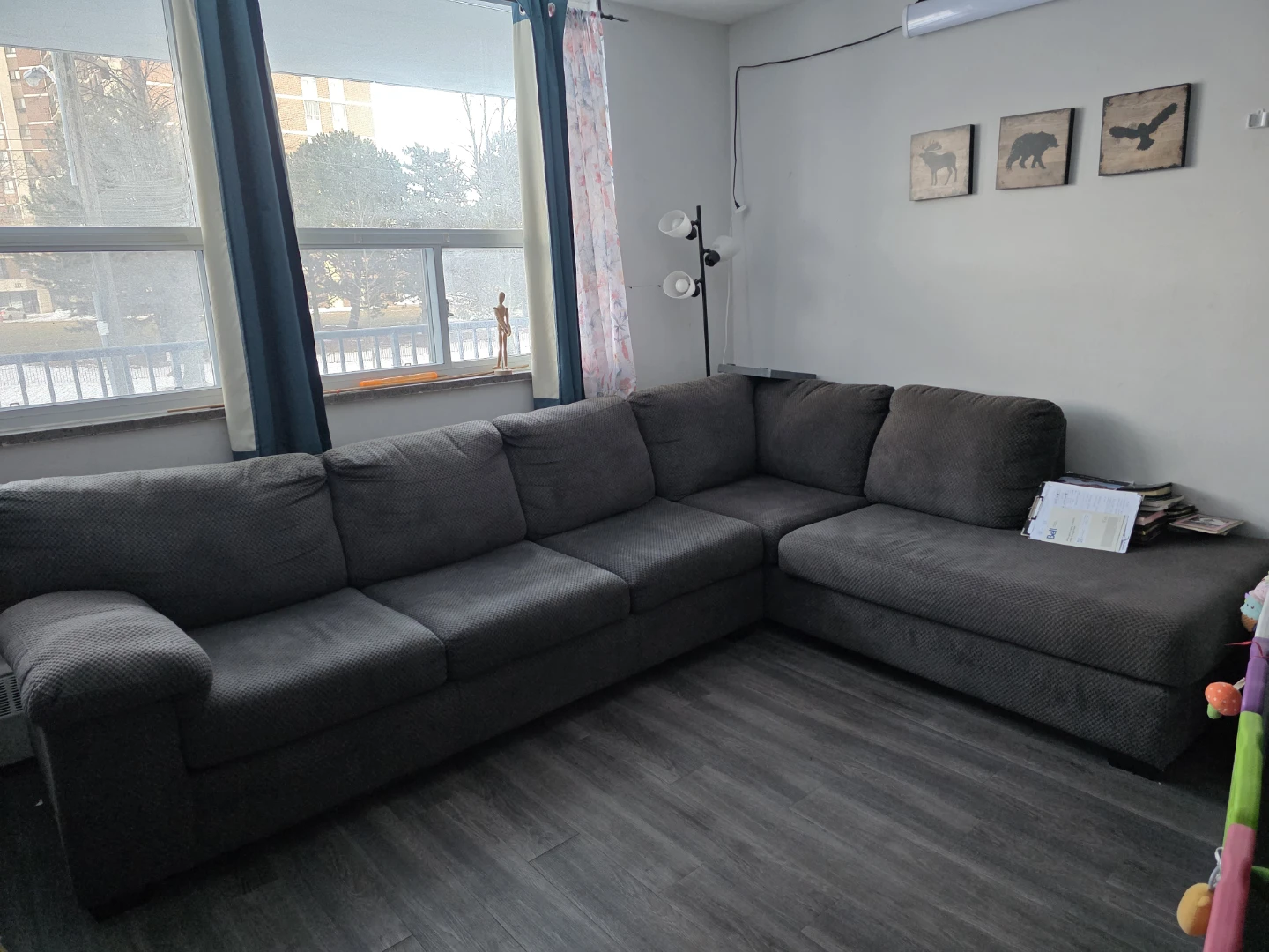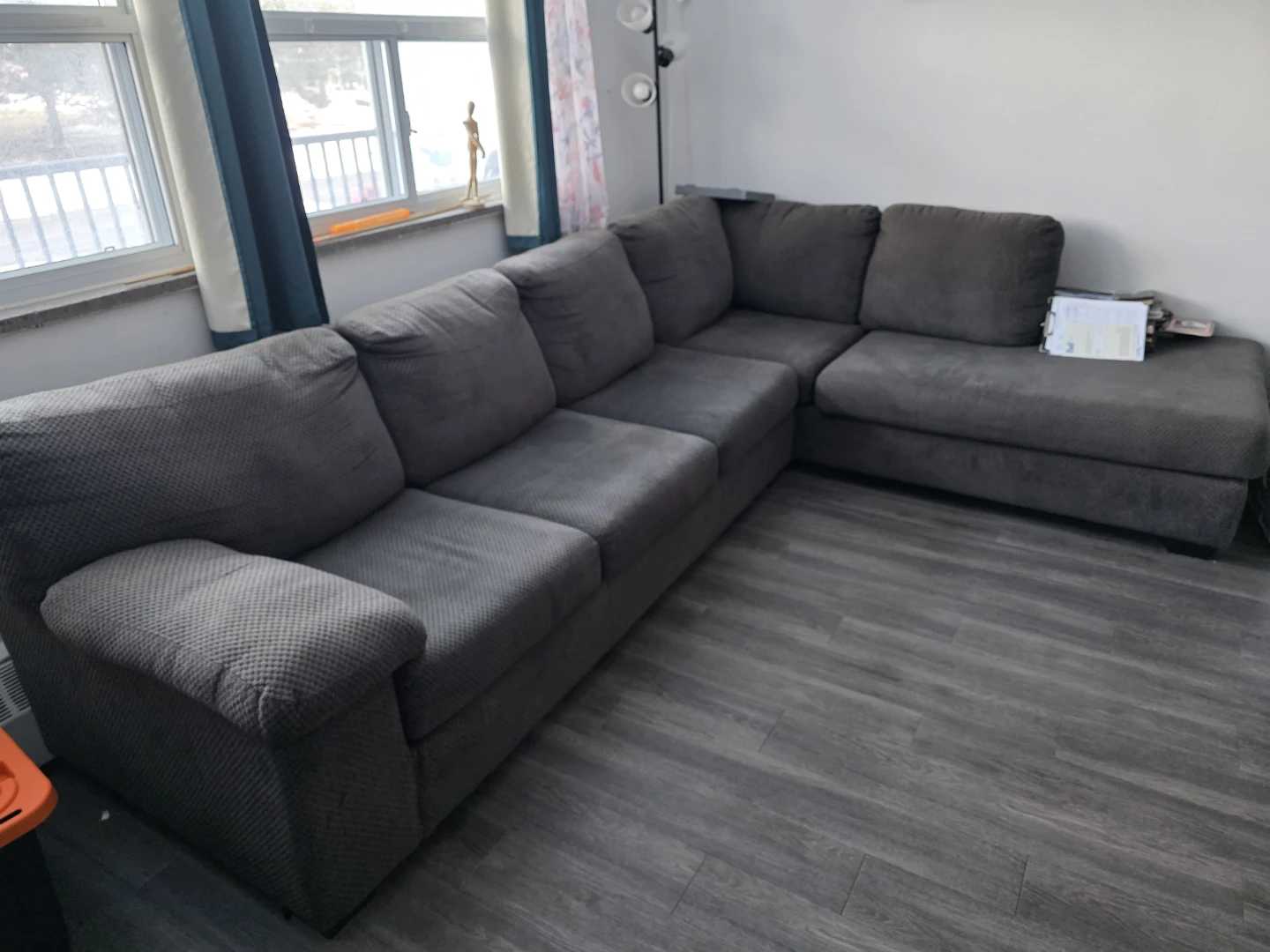 Selling a comfy grey sectional sofa! It's in good condition and ready for a new living room. Perfect for lounging and movie nights!