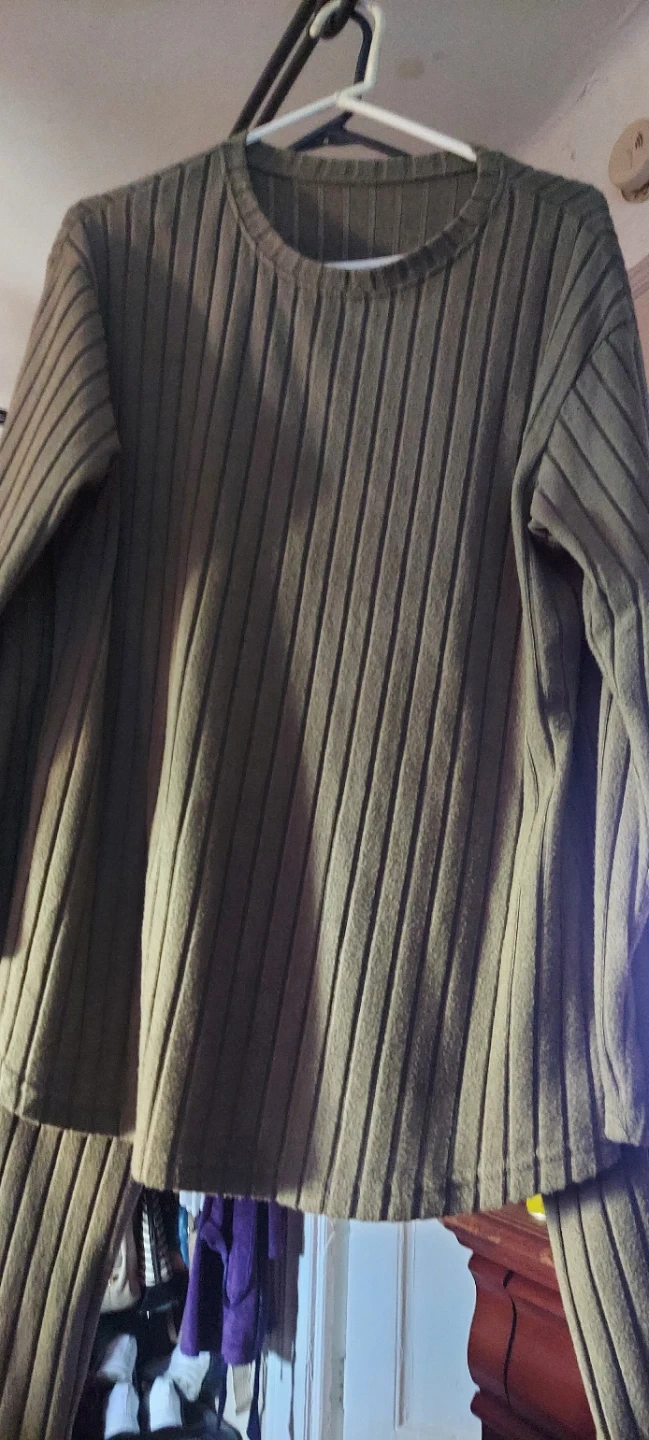 This olive green long sleeve top and pants features a ribbed texture. It's a size medium. Made from a soft fabric.
