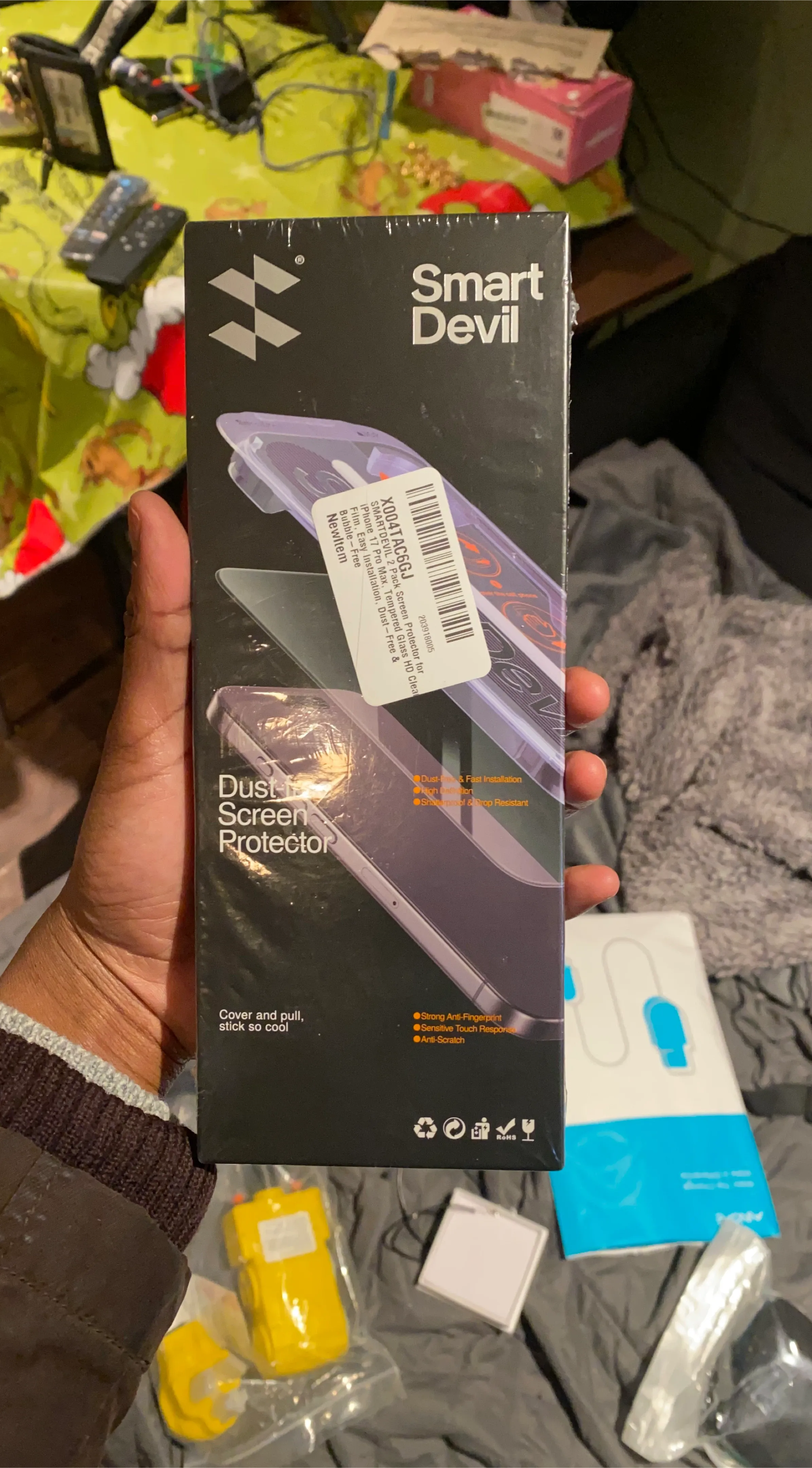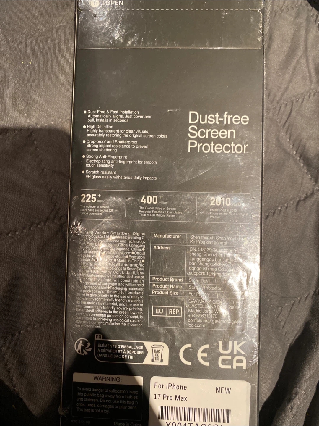This Smart Devil dust-free screen protector is designed for the iPhone 17 Pro Max. It offers dust-free and fast installation, high definition, strong anti-fingerprint, and is scratch-resistant. Made with 9H glass, it easily withstands daily impacts. It's great for keeping your phone screen pristine!