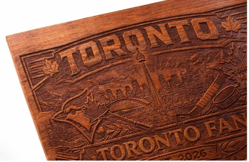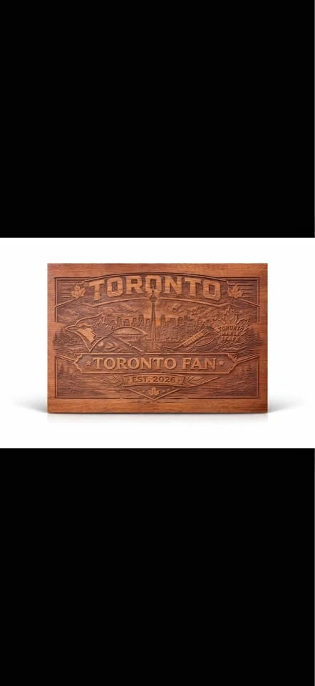 One-of-a-kind solid wood Toronto sports fan wall art featuring the Toronto skyline, Blue Jays-inspired baseball details, and Leafs-inspired hockey elements all carved into a rich wood panel. This piece has a bold, rustic look and is perfect for a man cave, rec room, sports room, cottage, or as a gift for a Toronto fan. Details: Price: $69, Material: Solid wood, Style: Rustic / sports / Toronto themed, Condition: New, handmade, Size: Approx. 24” x 14”. Beautiful depth and detail in the carving, with a warm stained finish that really stands out in person. This is not a cheap print — it’s a solid wood statement piece. Great for anyone who loves Toronto, hockey, baseball, and unique handmade decor. Pickup: [your area]
