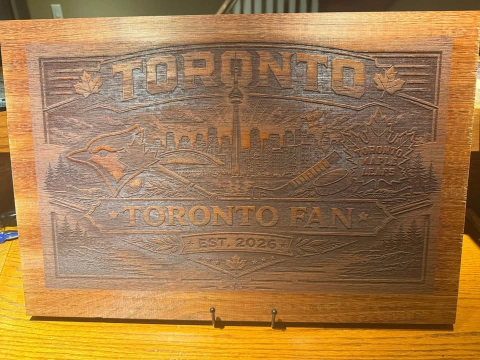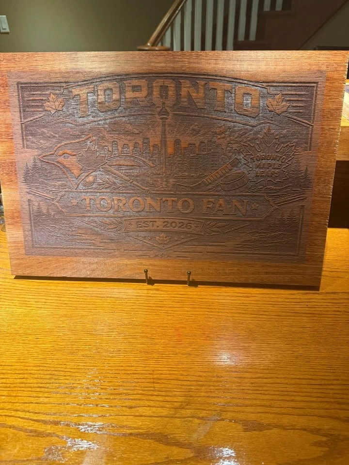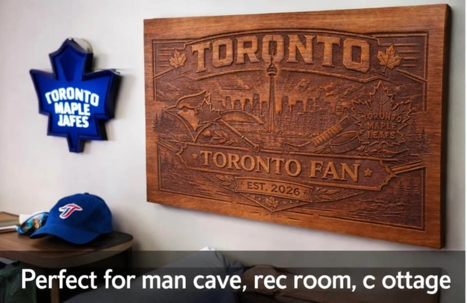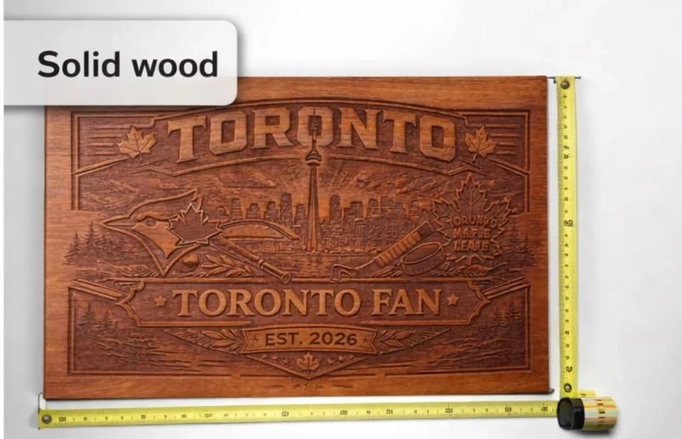 One-of-a-kind solid wood Toronto sports fan wall art featuring the Toronto skyline, Blue Jays-inspired baseball details, and Leafs-inspired hockey elements all carved into a rich wood panel. This piece has a bold, rustic look and is perfect for a man cave, rec room, sports room, cottage, or as a gift for a Toronto fan. Details: Price: $69, Material: Solid wood, Style: Rustic / sports / Toronto themed, Condition: New, handmade, Size: Approx. 24” x 14”. Beautiful depth and detail in the carving, with a warm stained finish that really stands out in person. This is not a cheap print — it’s a solid wood statement piece. Great for anyone who loves Toronto, hockey, baseball, and unique handmade decor. Pickup: [your area]