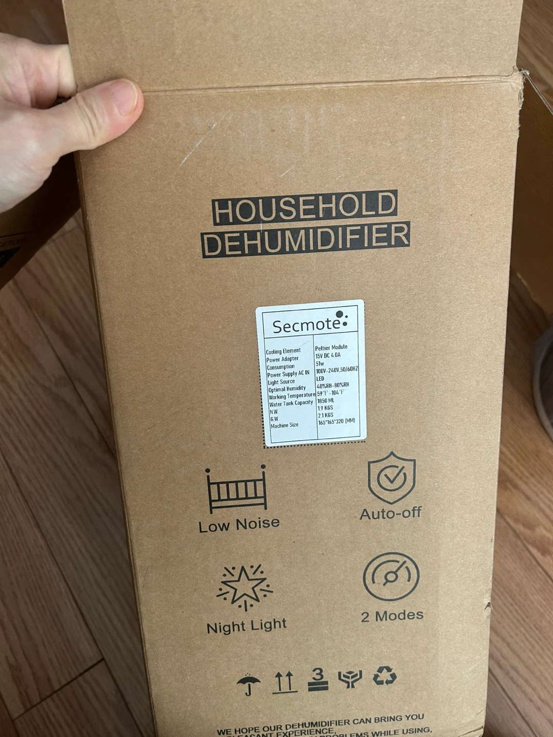 Brand new Secmote household dehumidifier with low noise and auto-off function. It has a night light and 2 modes. Water tank capacity is 1850ml . Machine size is 6.5"x5"x10" (DM6).