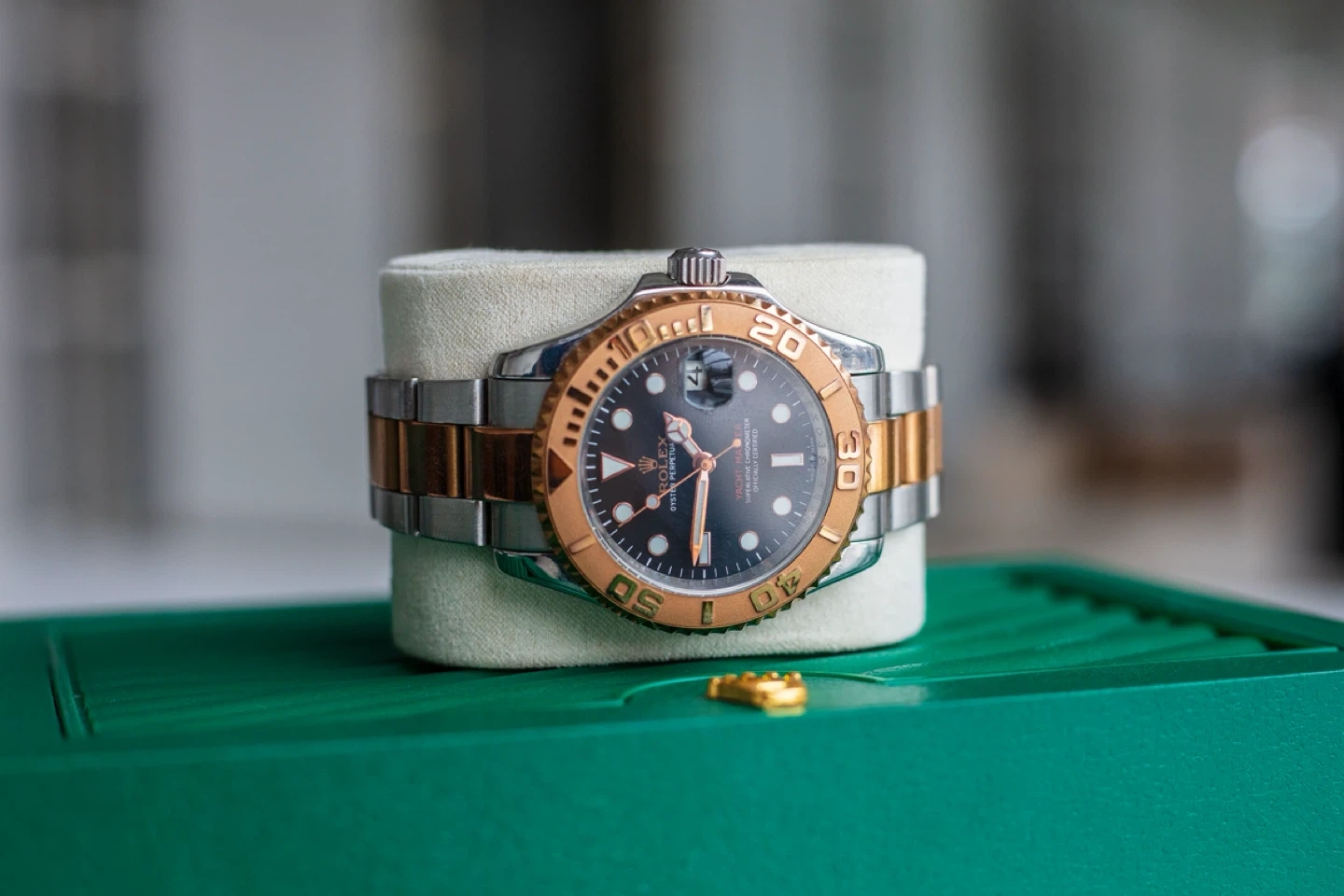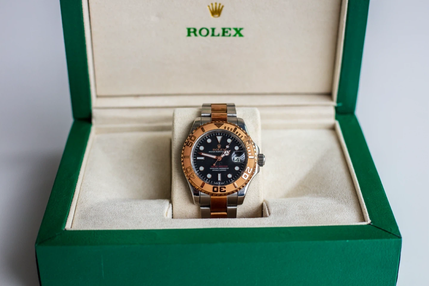 A Yacht-Master watch, two-tone stainless steel and rose gold. Includes box. Automatic movement with date complication.