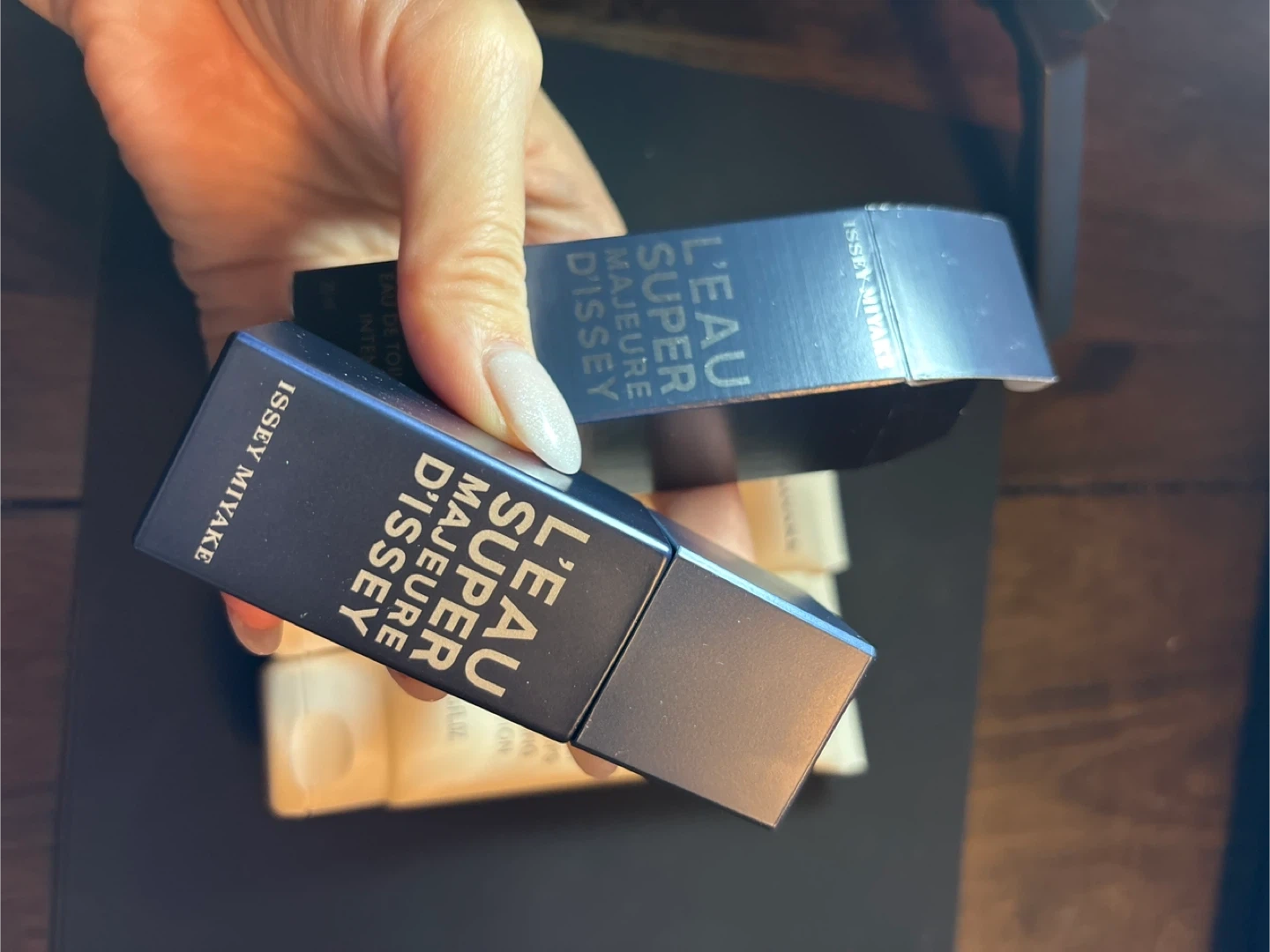 This set includes Issey Miyake L'Eau Super Majeure D'Issey Eau de Toilette intense 20ml, a 75ml moisturising hand cream, and a 75ml moisturising body lotion. The hand cream is "a drop d'issey" and the body lotion is "L'eau d'issey".