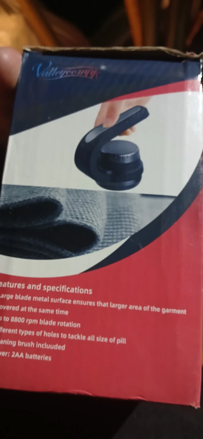 Valleylifestyle fabric shaver for removing pills and fuzz from clothing. It features a large blade metal surface and operates up to 8800 rpm. Includes a cleaning brush and is powered by 2AA batteries.