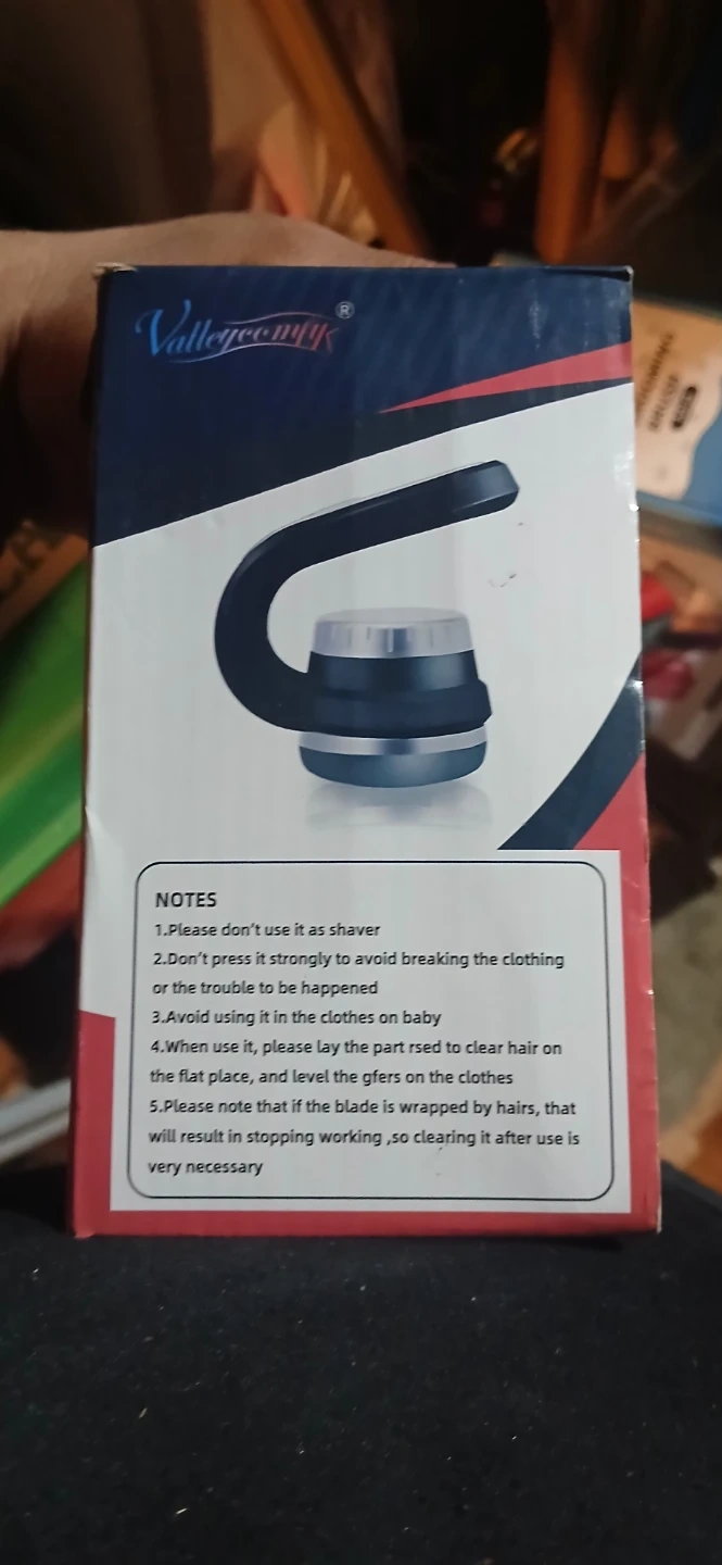 Valleylifestyle fabric shaver for removing pills and fuzz from clothing. It features a large blade metal surface and operates up to 8800 rpm. Includes a cleaning brush and is powered by 2AA batteries.