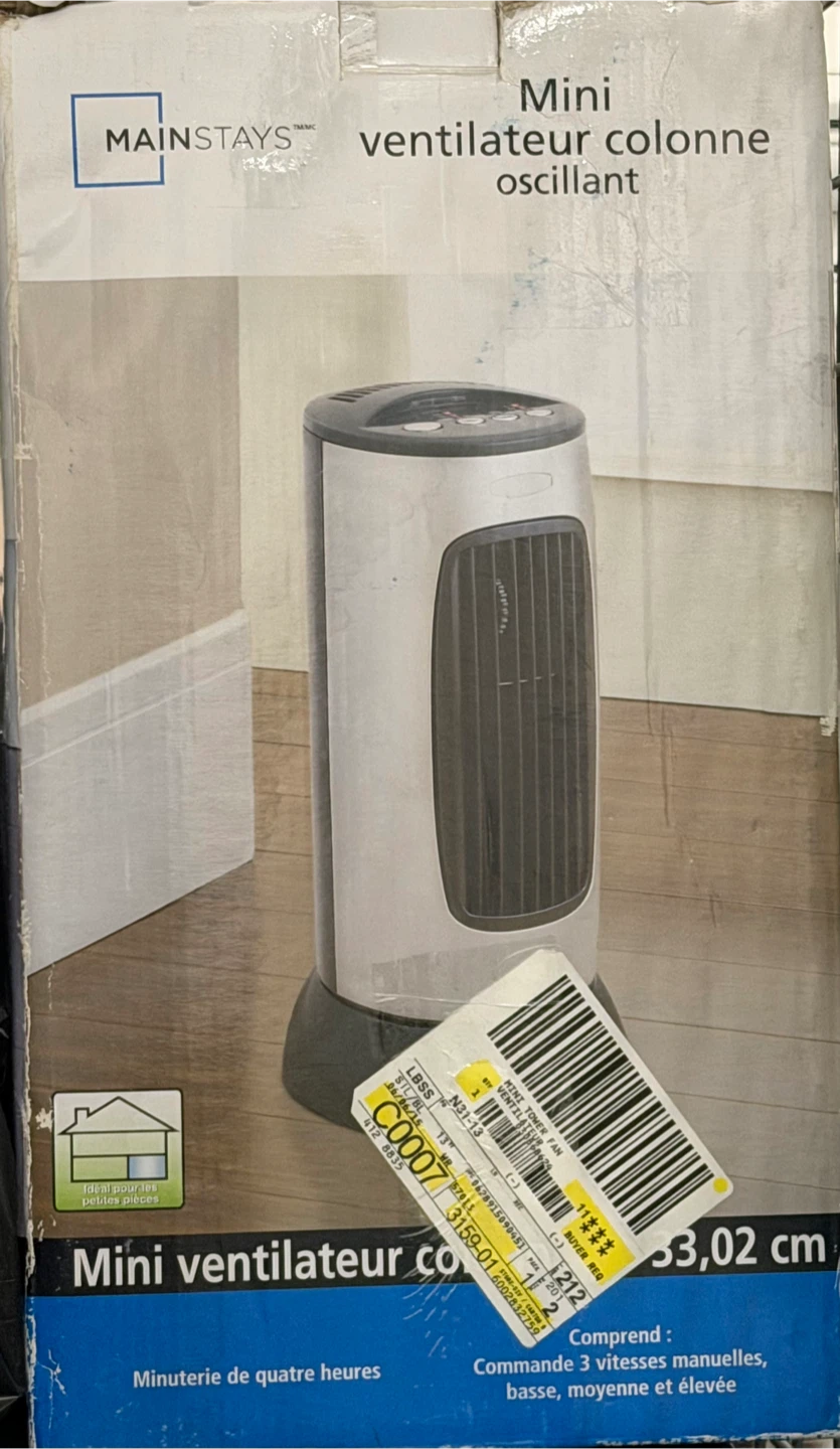 This is a Mainstays mini oscillating tower fan. It's ideal for small spaces. It has a four-hour timer and three manual speed settings: low, medium, and high