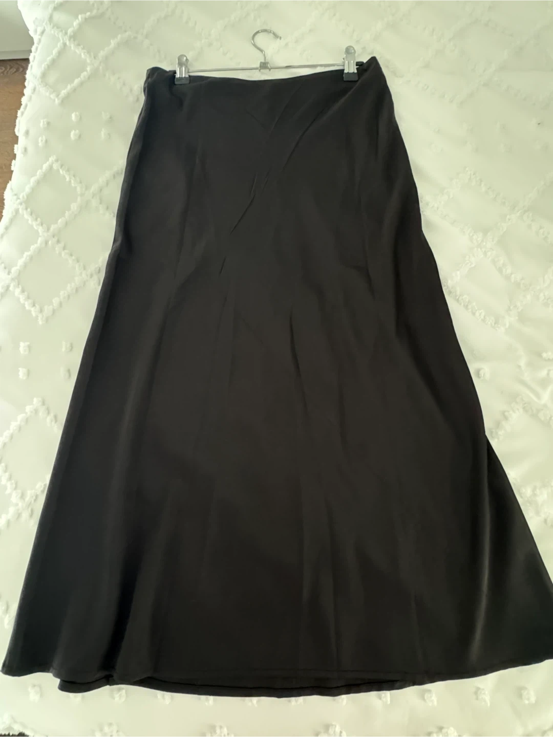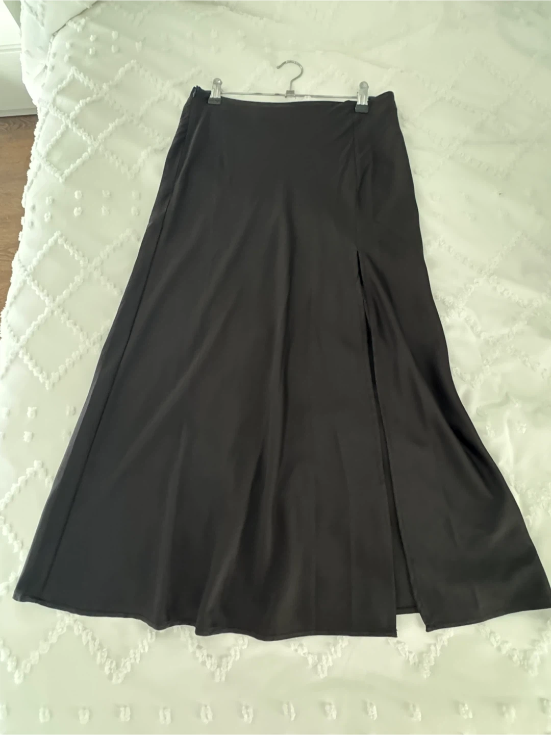 This black midi skirt has a satin finish and a side slit. It's a stylish choice for dressing up or down. Pairs well with blouses or t-shirts.