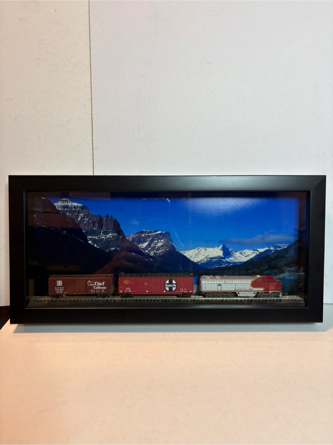 Framed train display featuring a mountain backdrop. The trains include Santa Fe and Chief California cars. It's a nice piece for any train enthusiast!