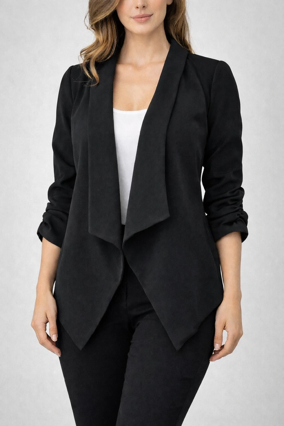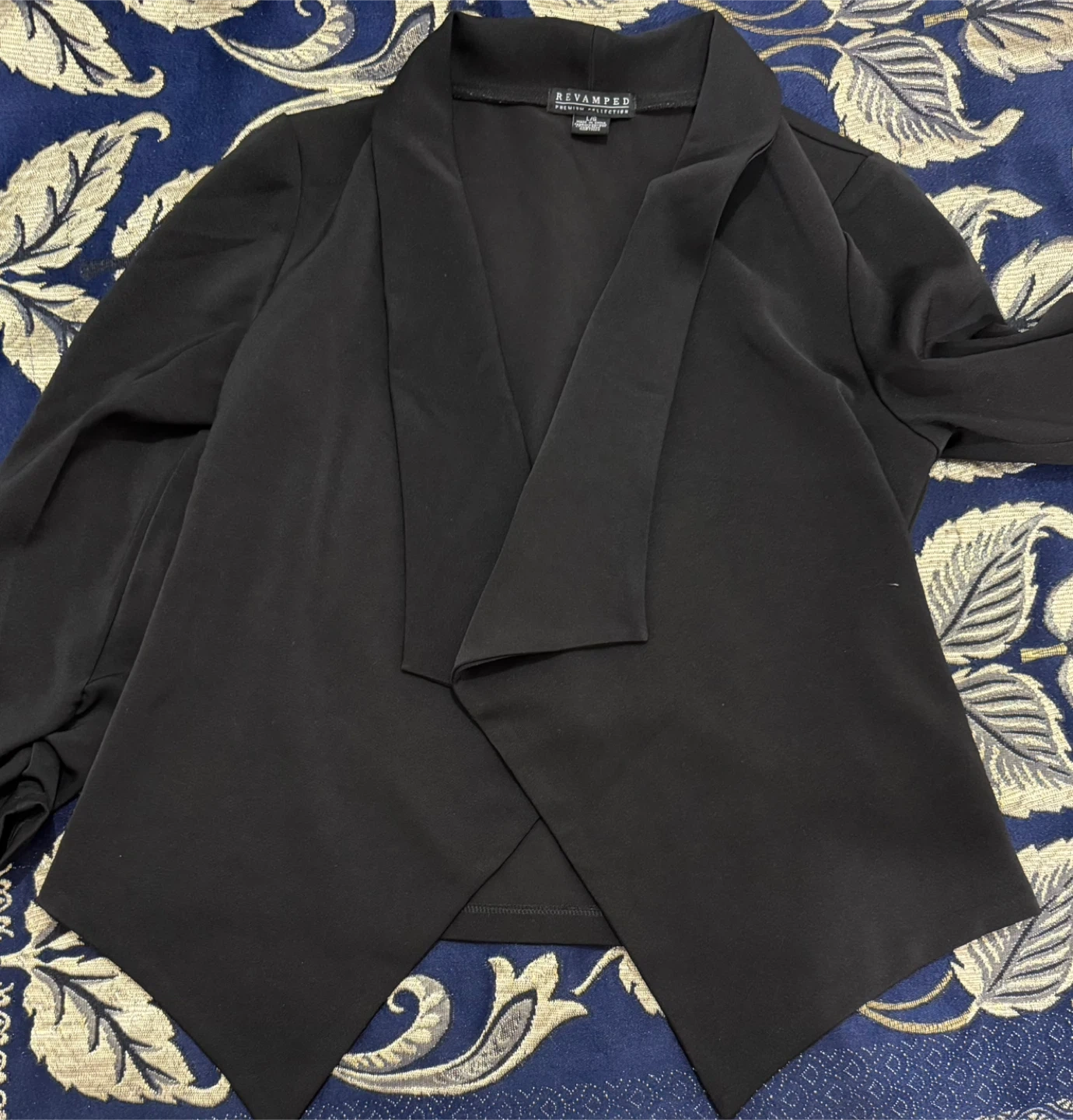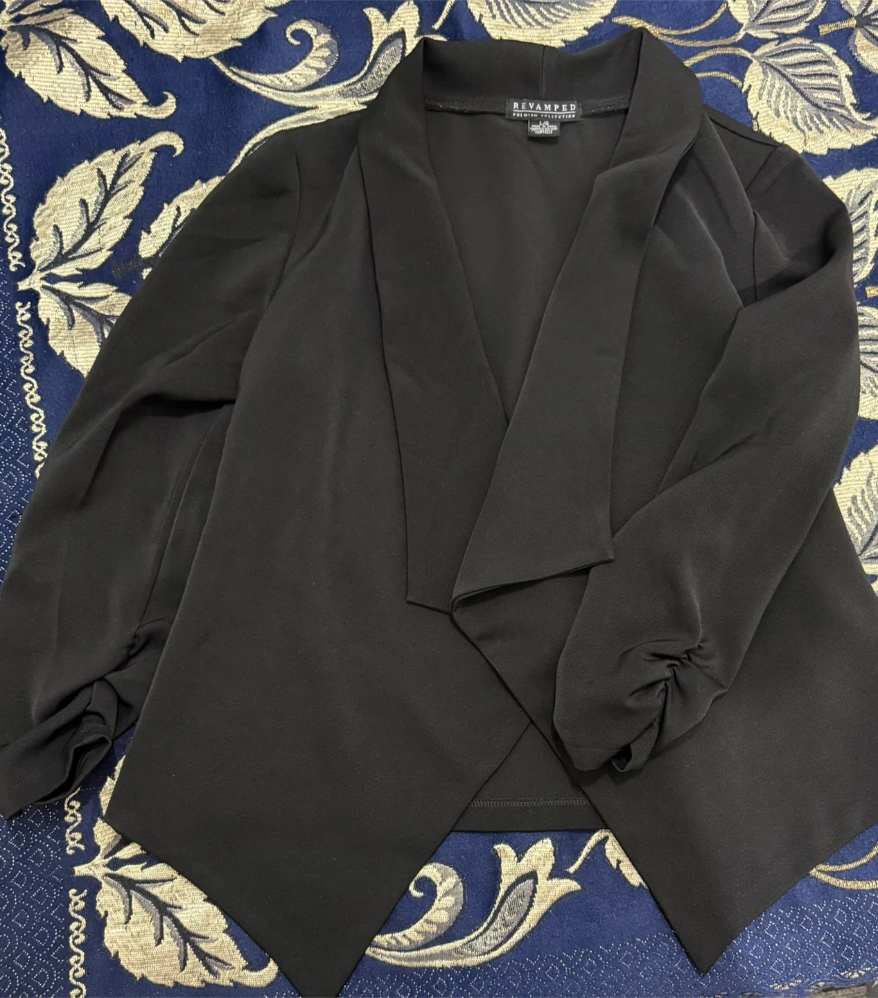 Selling a black blazer from Revamped's Premium Collection in size L. It's made of 97% polyester and 3% spandex. Features a stylish open-front design with ruched sleeves. Perfect for adding a touch of sophistication to any outfit!