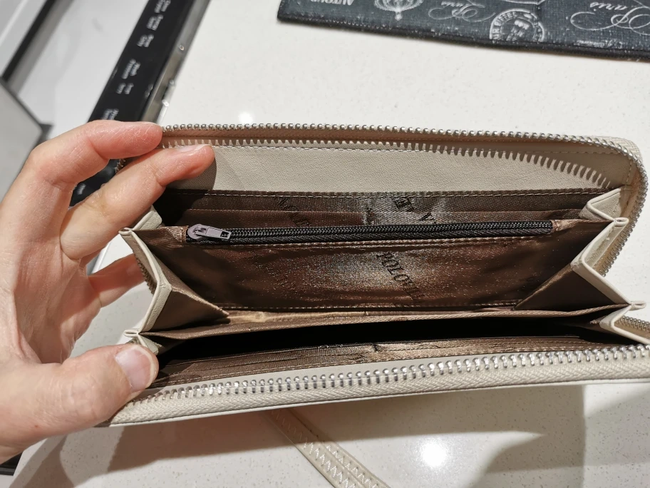 This is a Polo Villae wallet with a colour block design. It features orange, white, and yellow sections. The wallet has a zipper closure and a wrist strap.