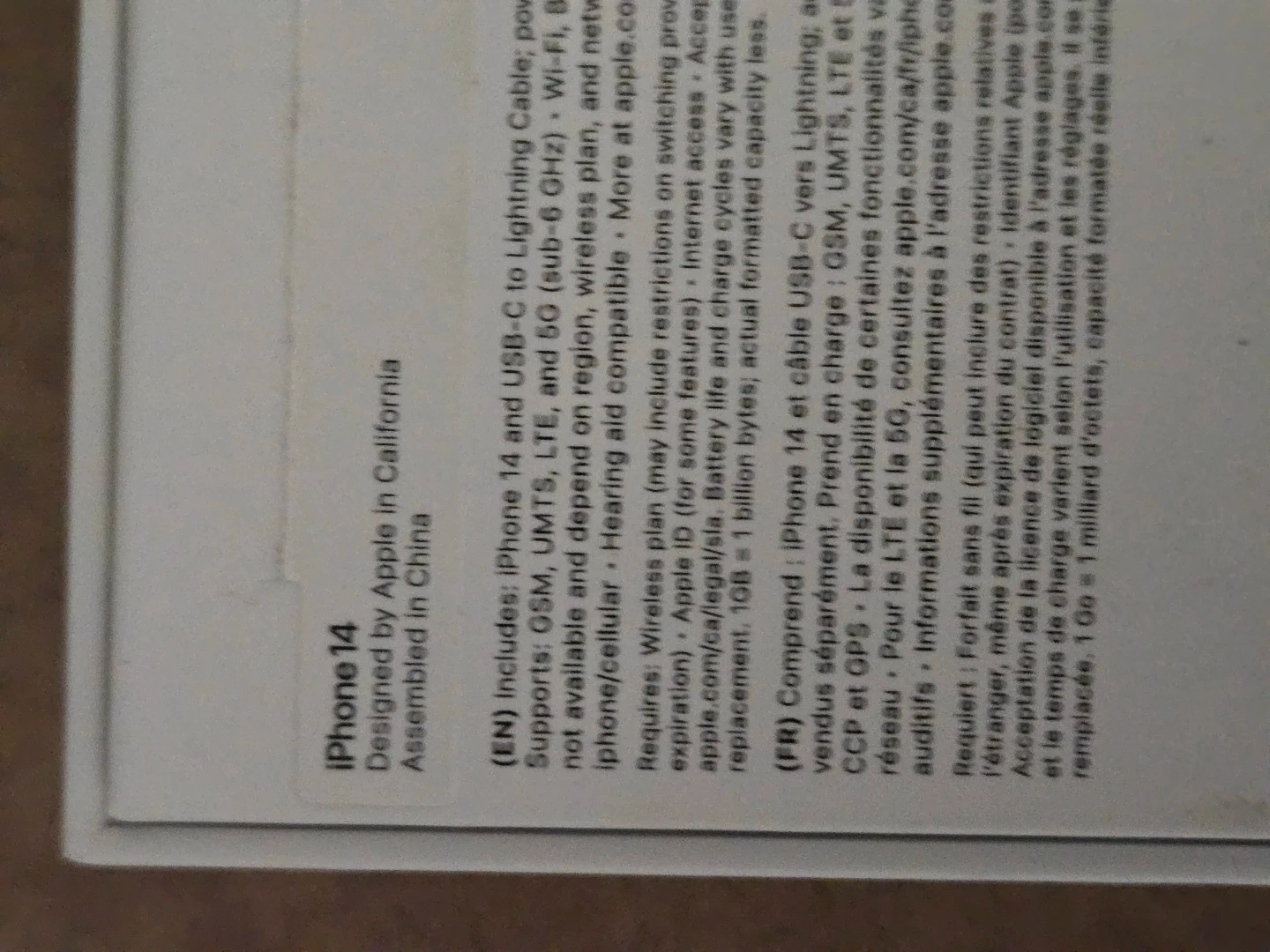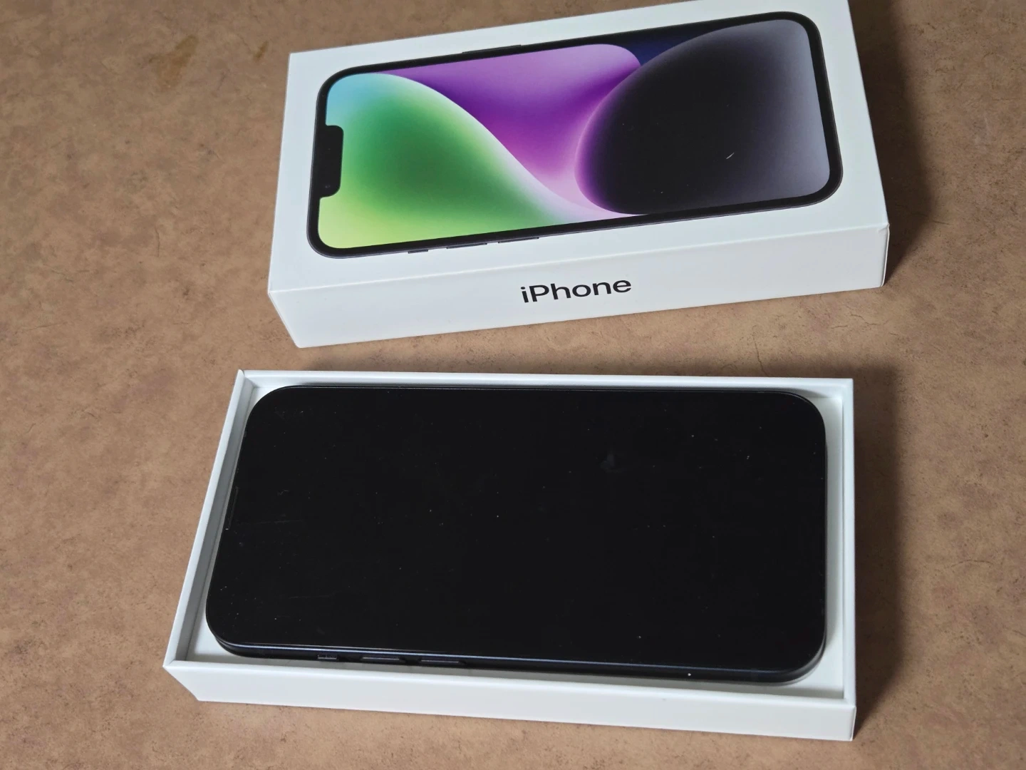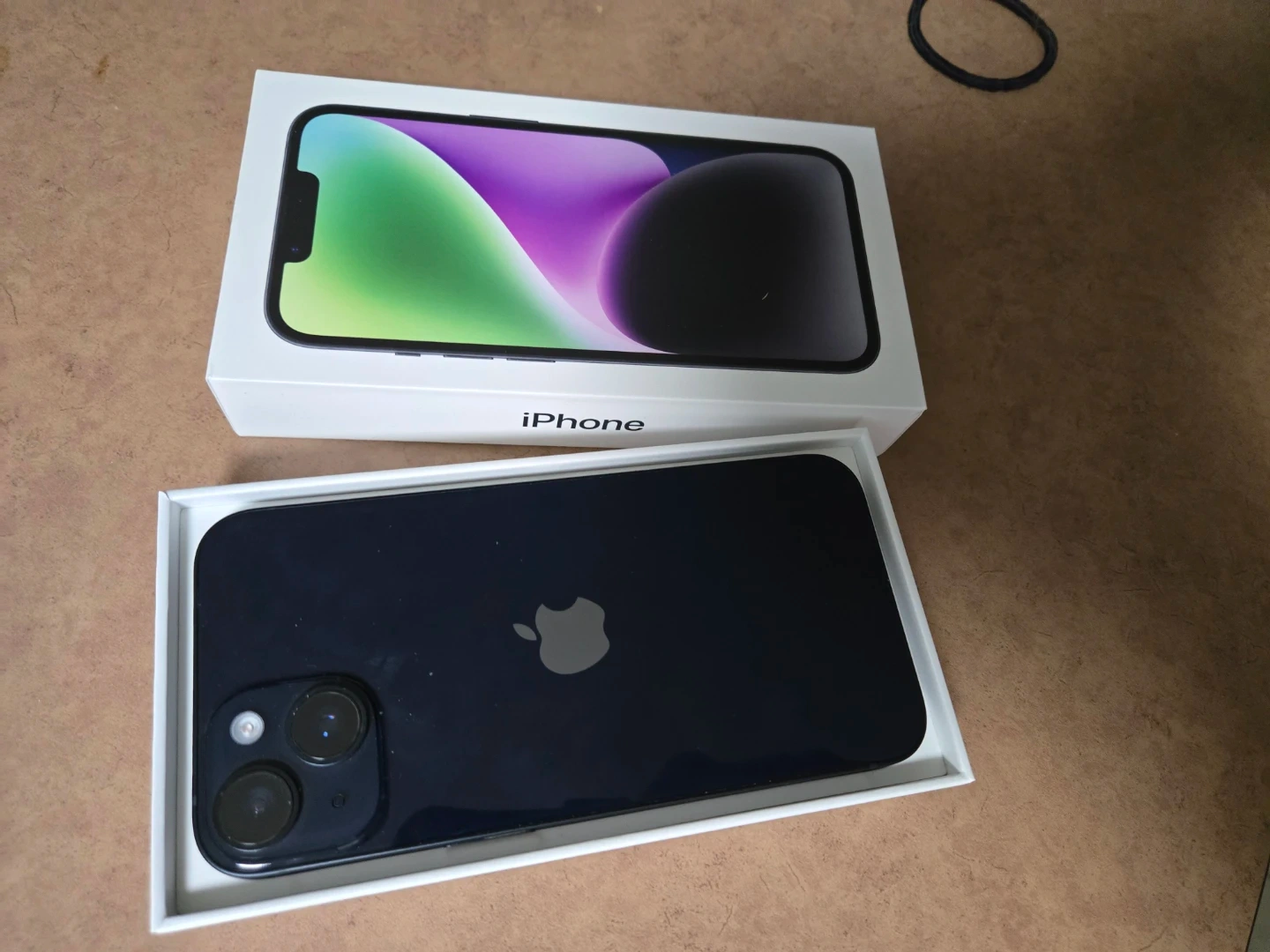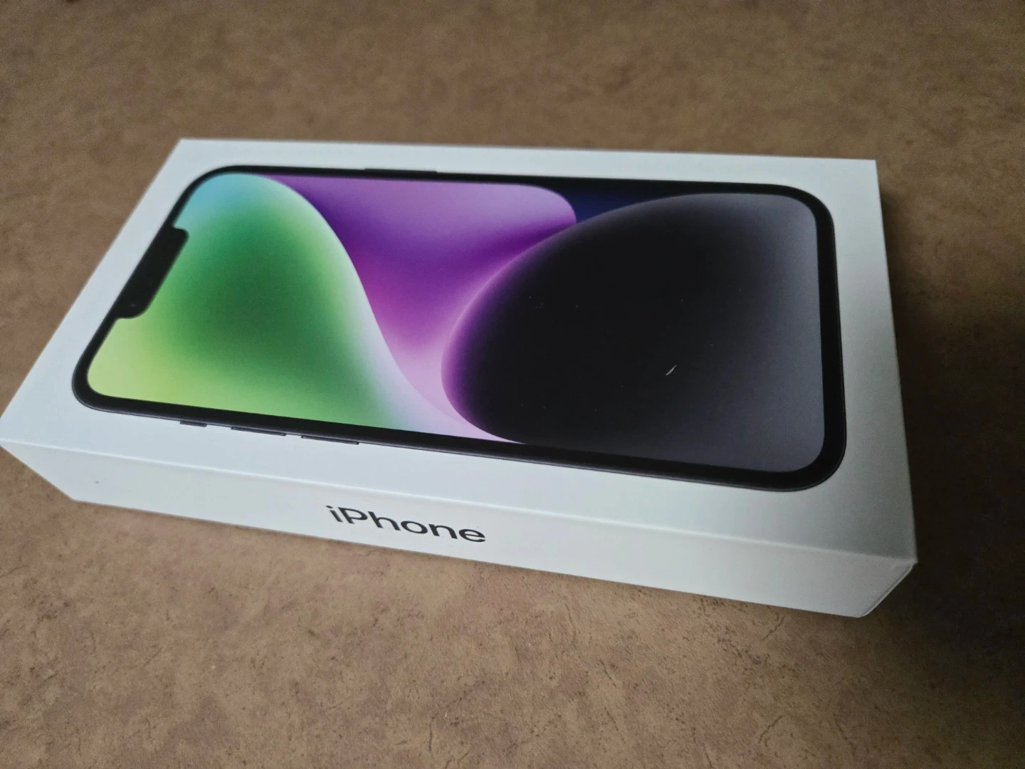 This is an Apple iPhone 14 in Midnight. It supports GSM, UMTS, LTE, and 5G connectivity. The device is designed for use with wireless plans and is hearing aid compatible. It includes the original box.