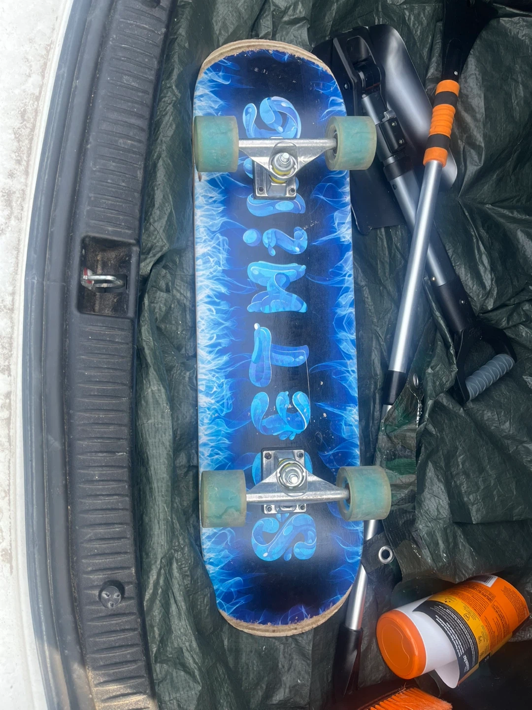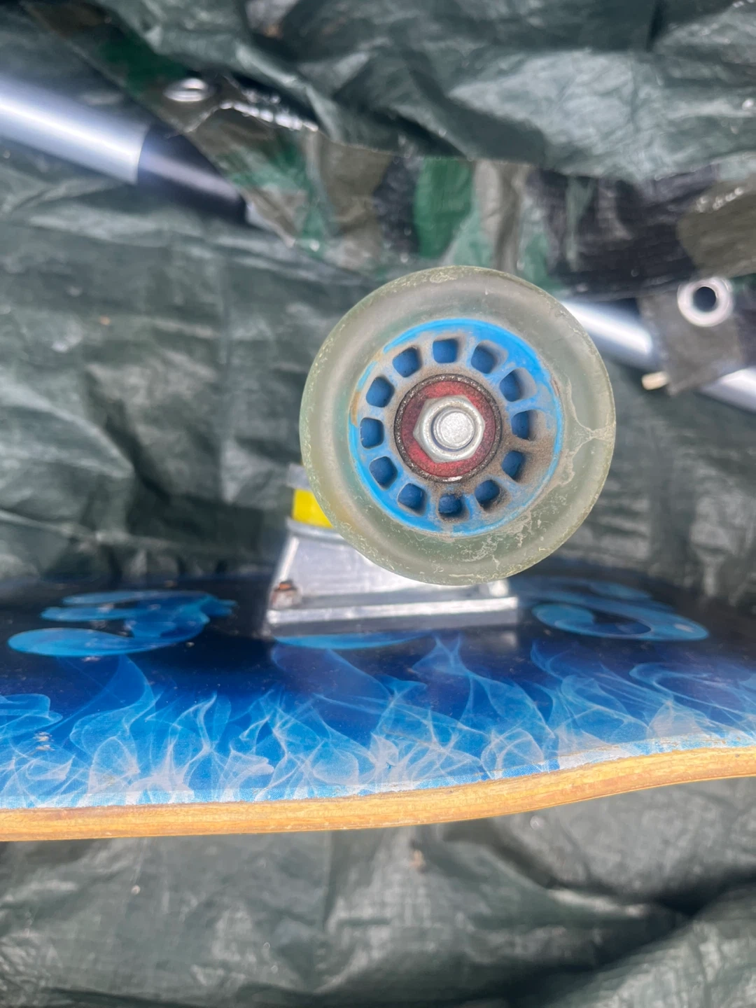 A Flip-Top skateboard with a blue flame design on the bottom. It features clear wheels with blue and red accents. Ready for some cruising!
