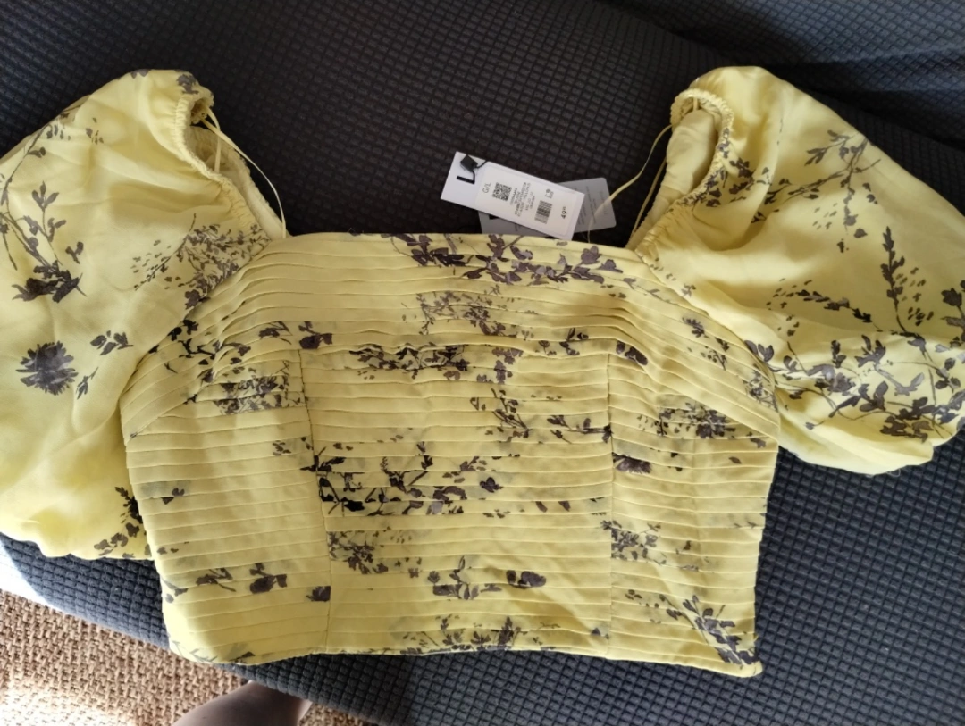Cute yellow crop top. Floral print. Puff sleeves. Pleated detail. Size L
