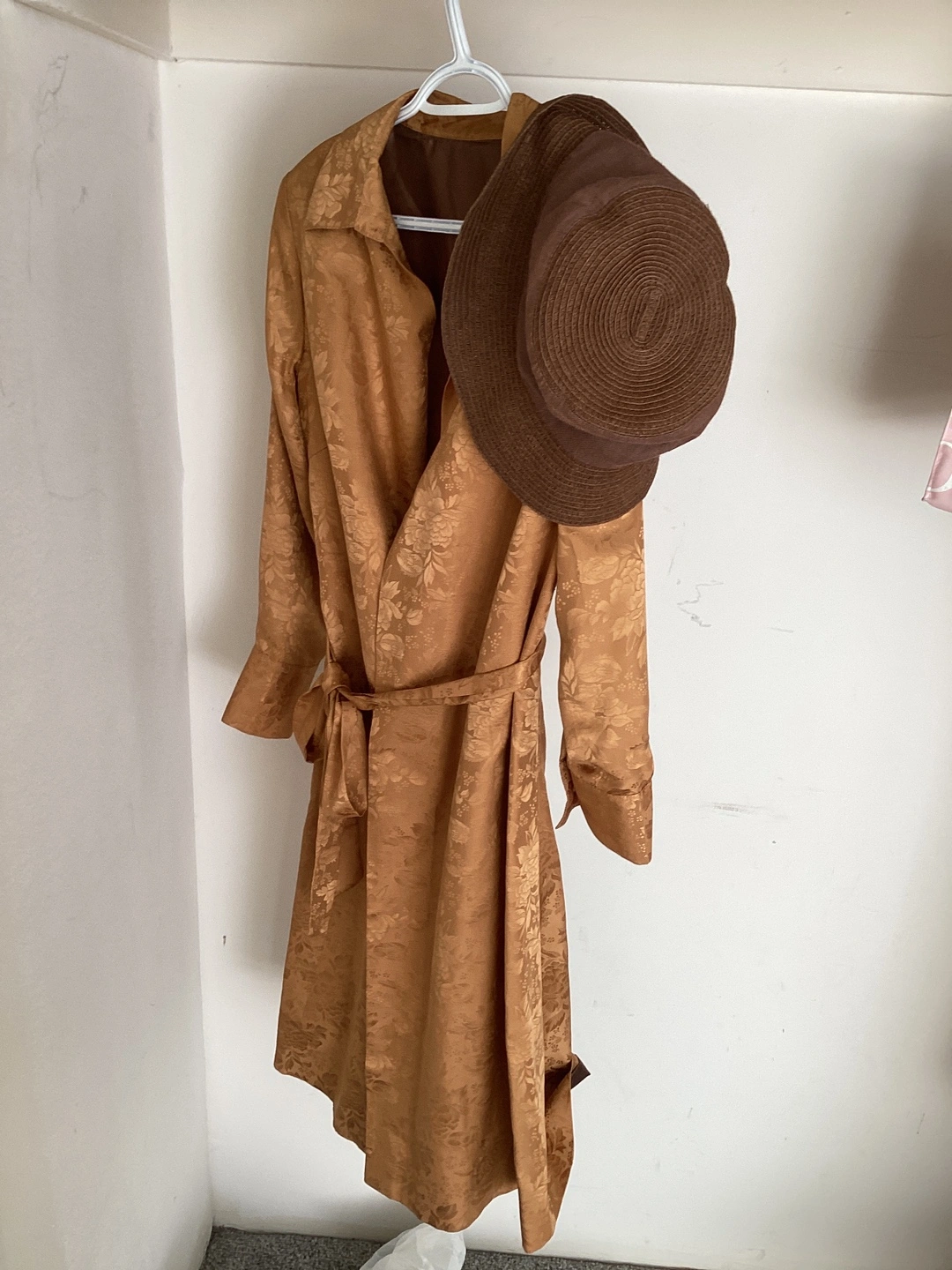 This is a beautiful gold trench coat with a subtle floral pattern. It has a tie at the waist and a classic trench coat cut. And the brown hat .Perfect for adding a touch of elegance to any outfit!