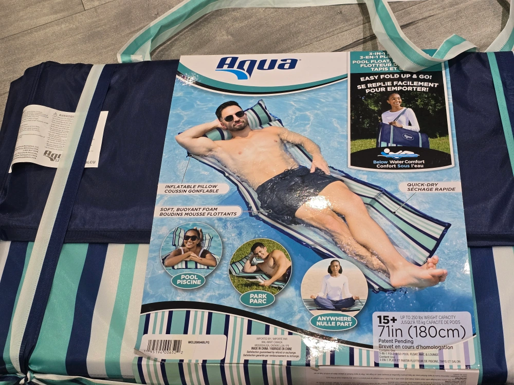 Selling a brand new Aqua 3-in-1 Pool Float Mat & Lounge! It's a 71in (180cm) pool float mat and lounge. It's easy to fold up and go! It has an inflatable pillow and soft, buoyant foam. It's quick drying and supports up to 250 lb weight capacity