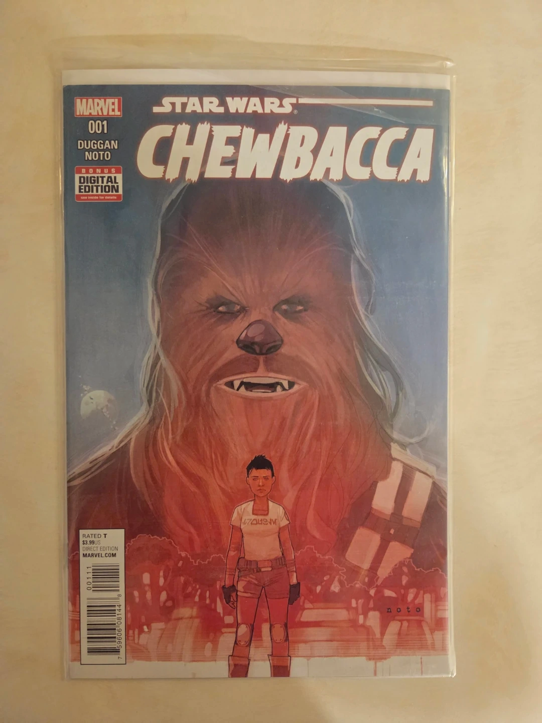 "Written by Gerry Duggan. Art and Cover by Phil Noto. Known as the skilled co-pilot of the infamous Millennium Falcon, the legendary Wookiee warrior CHEWBACCA will star in his very own limited comic series! After the battle of Yavin, Chewbacca is on his own when he crash lands his ship on an Imperial occupied planet. Now stranded, Chewie finds himself caught in the middle of trying to return to the rebellion and helping a young and feisty girl in need. 28 pages, full color"