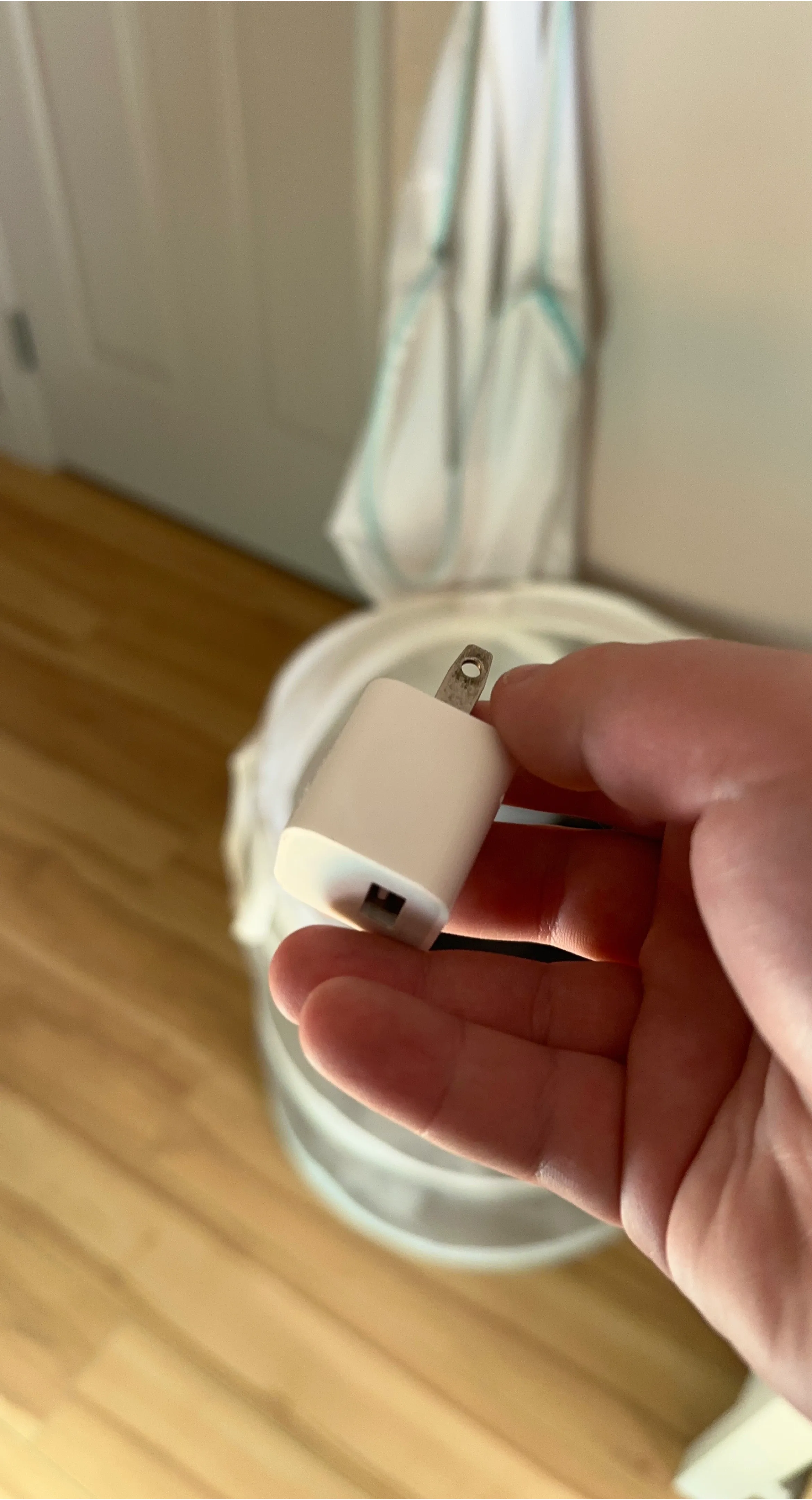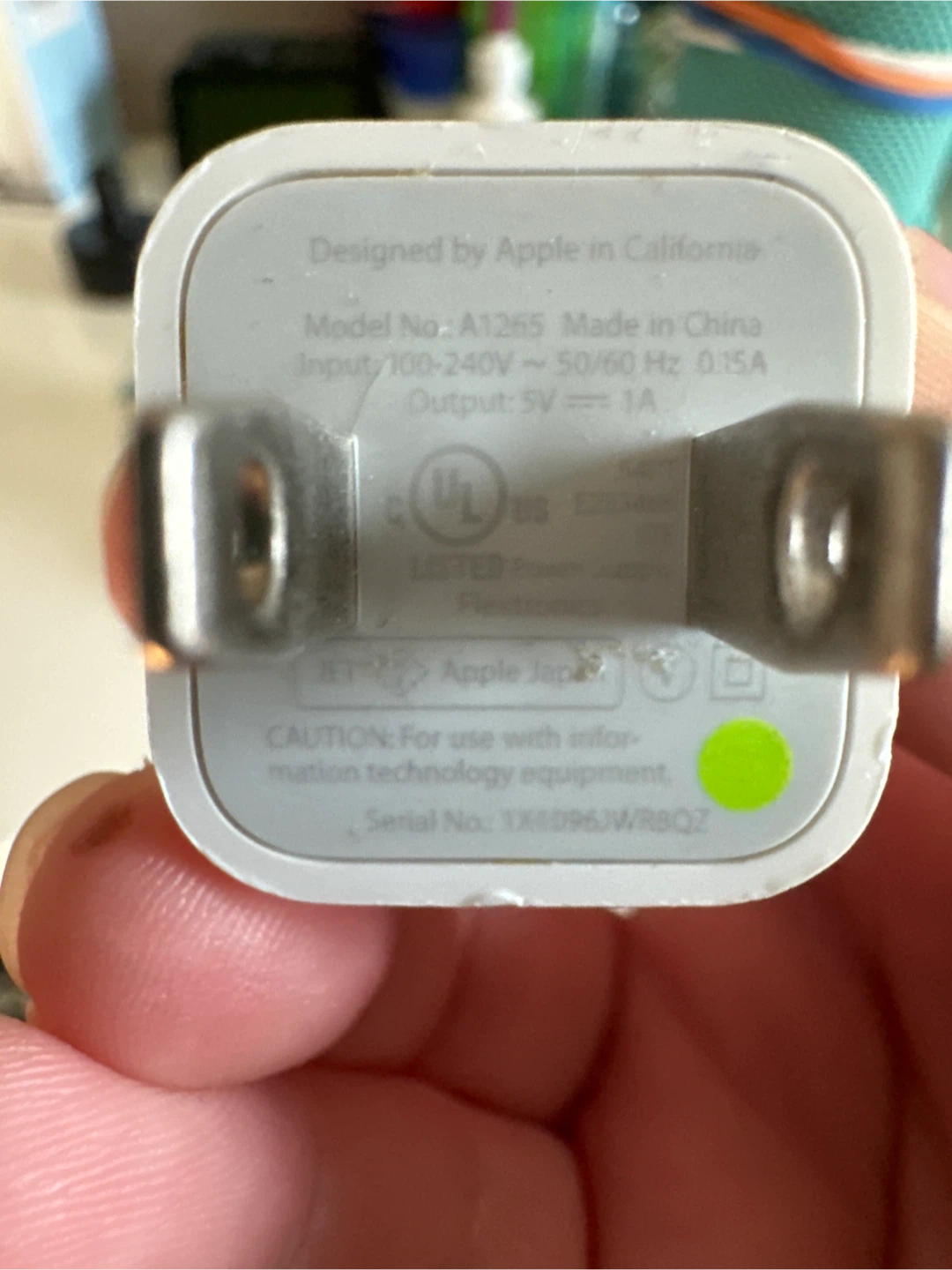 Apple A1265 USB power adapter designed in California. Input 100-240V, 50/60 Hz, 0.75A. Output 5V = 1A. Made in China.