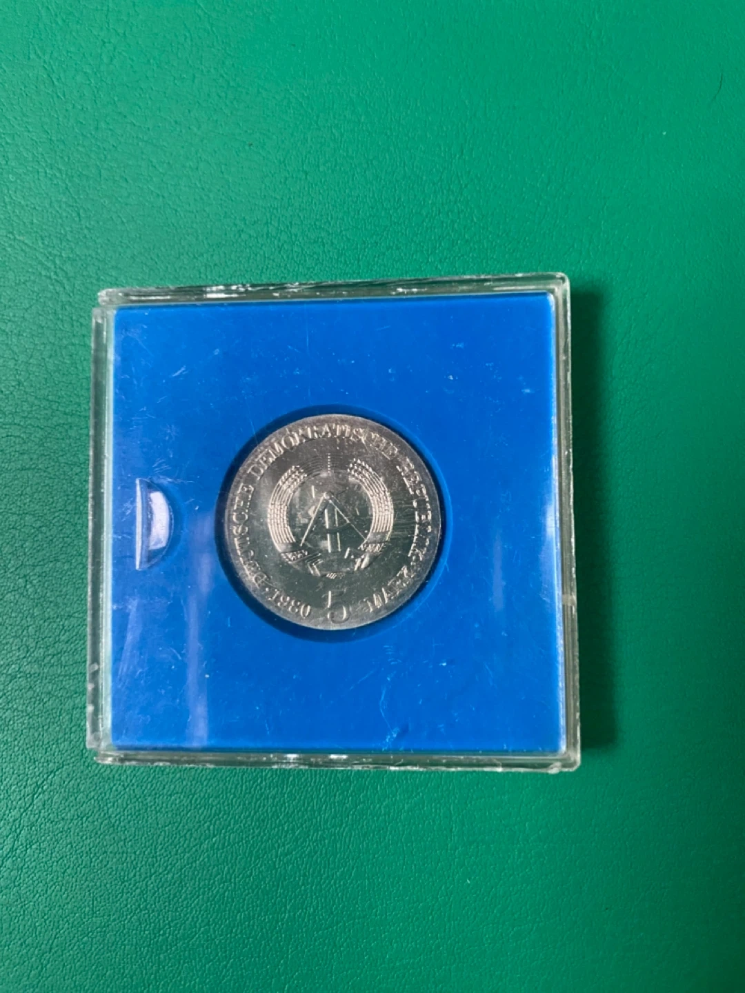 This is a 1980 East German 5 Mark coin. It features the national emblem on one side and a portrait of Adolph von Menzel on the other. Comes in a protective plastic case.
