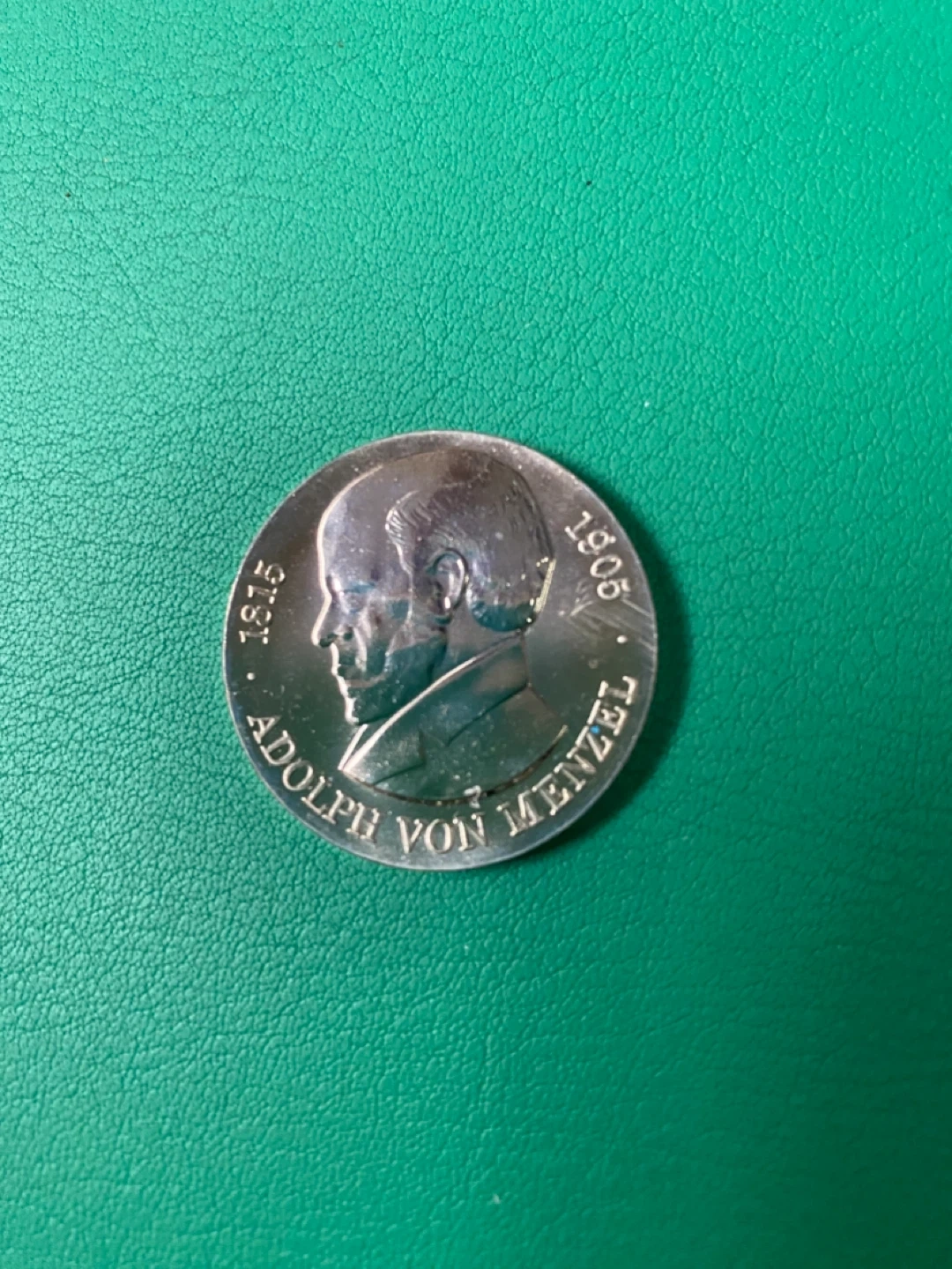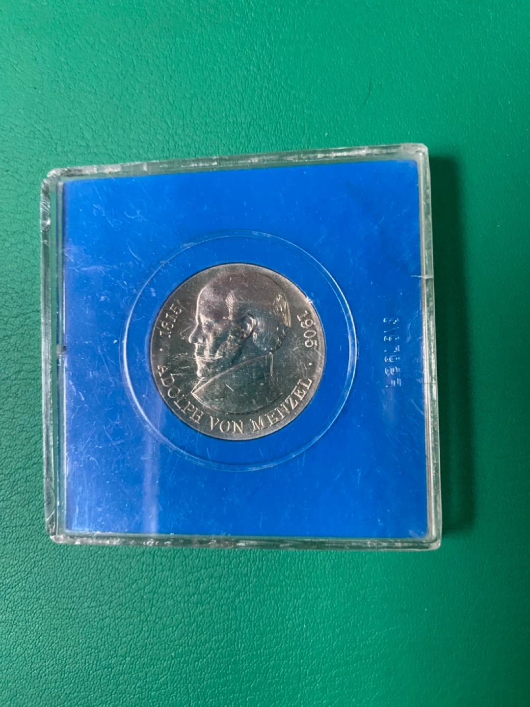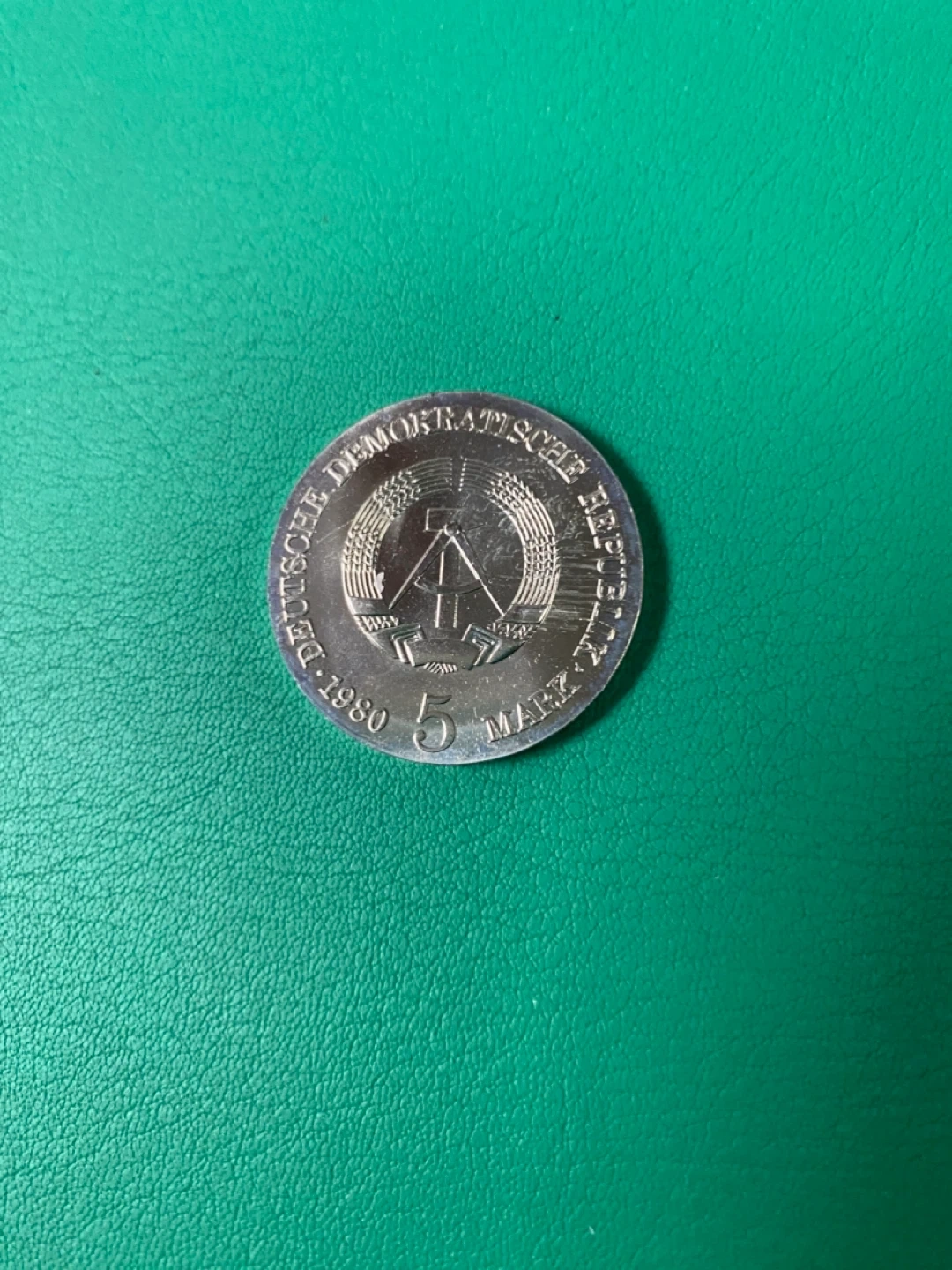 This is a 1980 East German 5 Mark coin. It features the national emblem on one side and a portrait of Adolph von Menzel on the other. Comes in a protective plastic case.