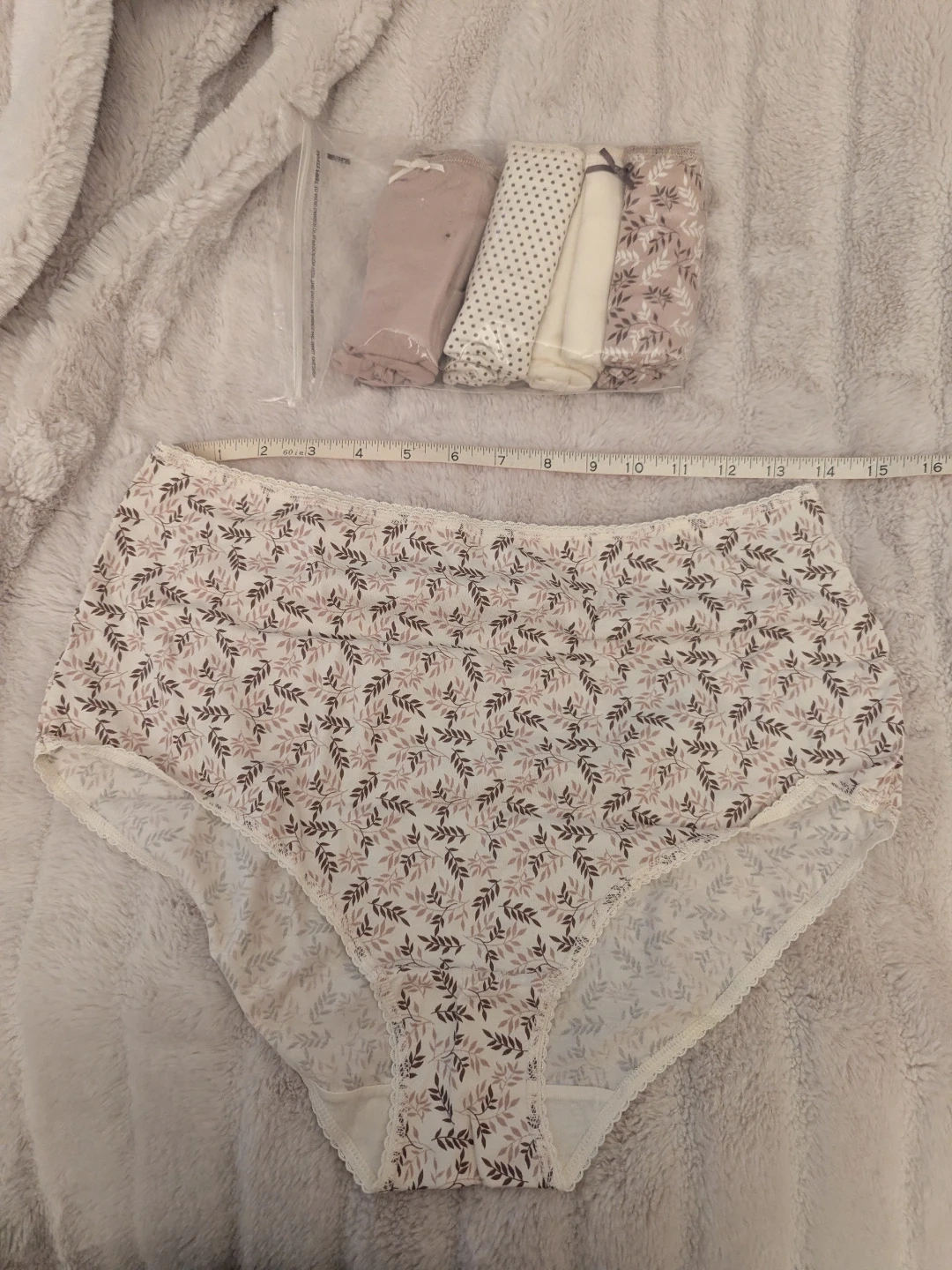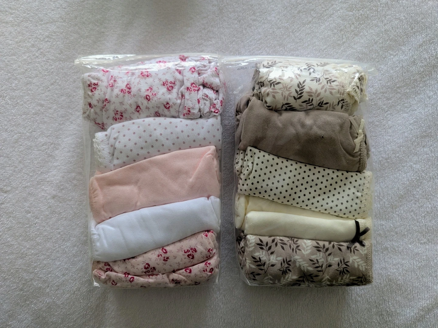Two packs of brand new ladies' underwear with various floral and polka dot patterns, made with 95% cotton, 5% spandex blend for comfort.