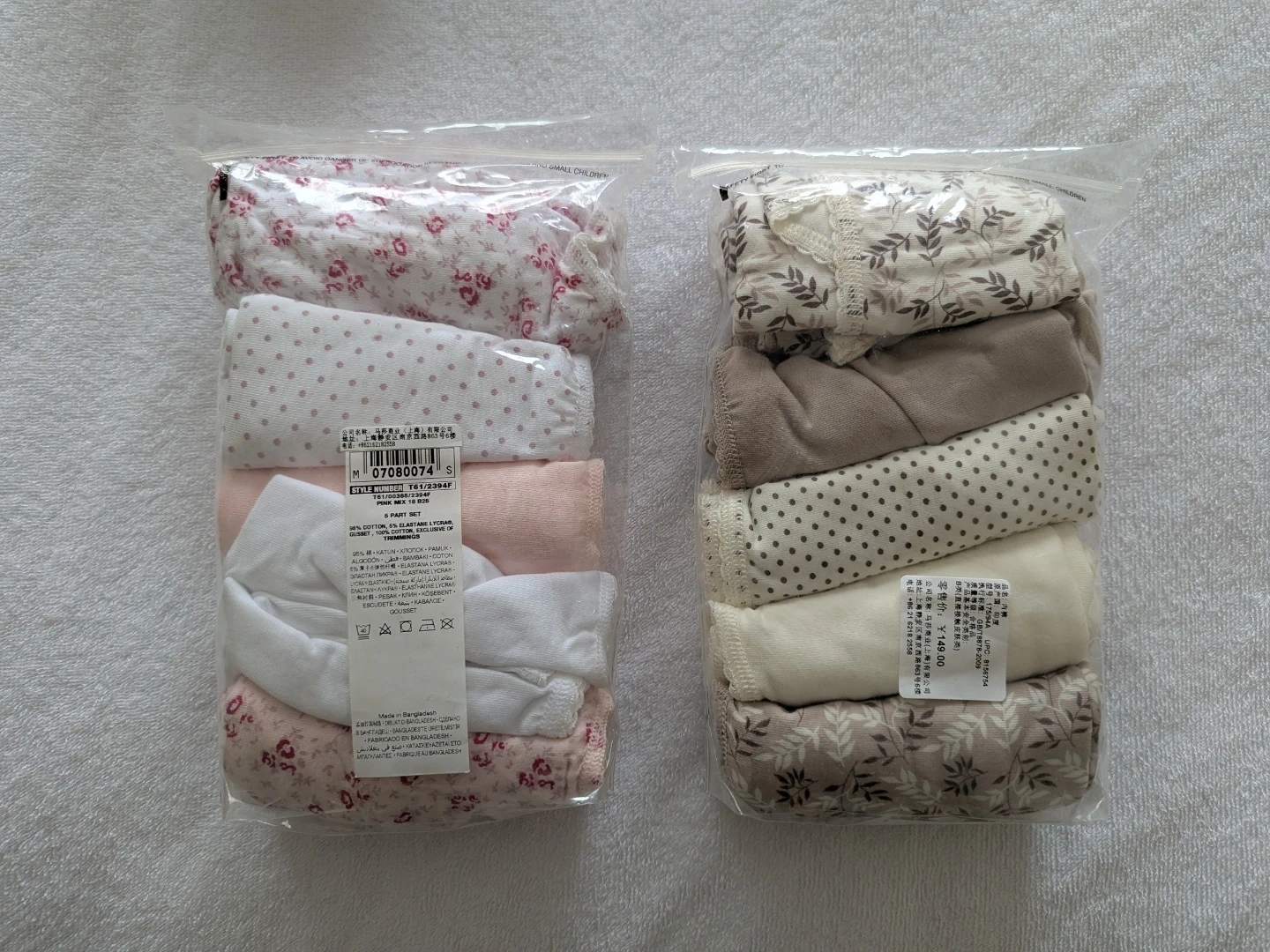 Two packs of brand new ladies' underwear with various floral and polka dot patterns, made with 95% cotton, 5% spandex blend for comfort.