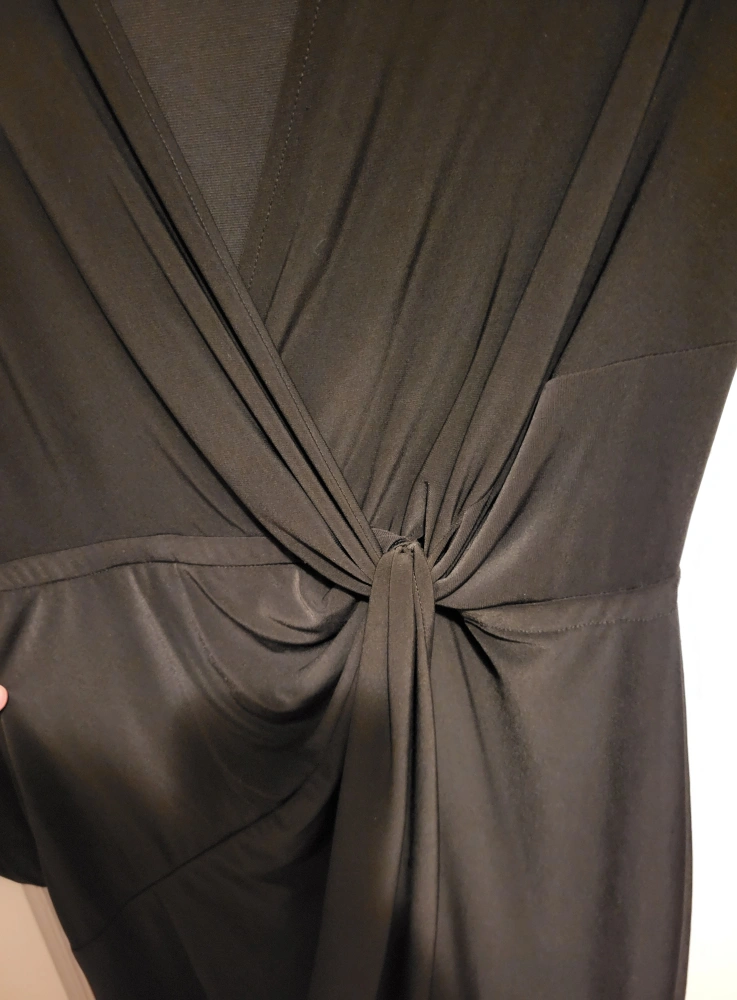 Has a deep V-neckline, a faux wrap at the front with cascading twist detail.