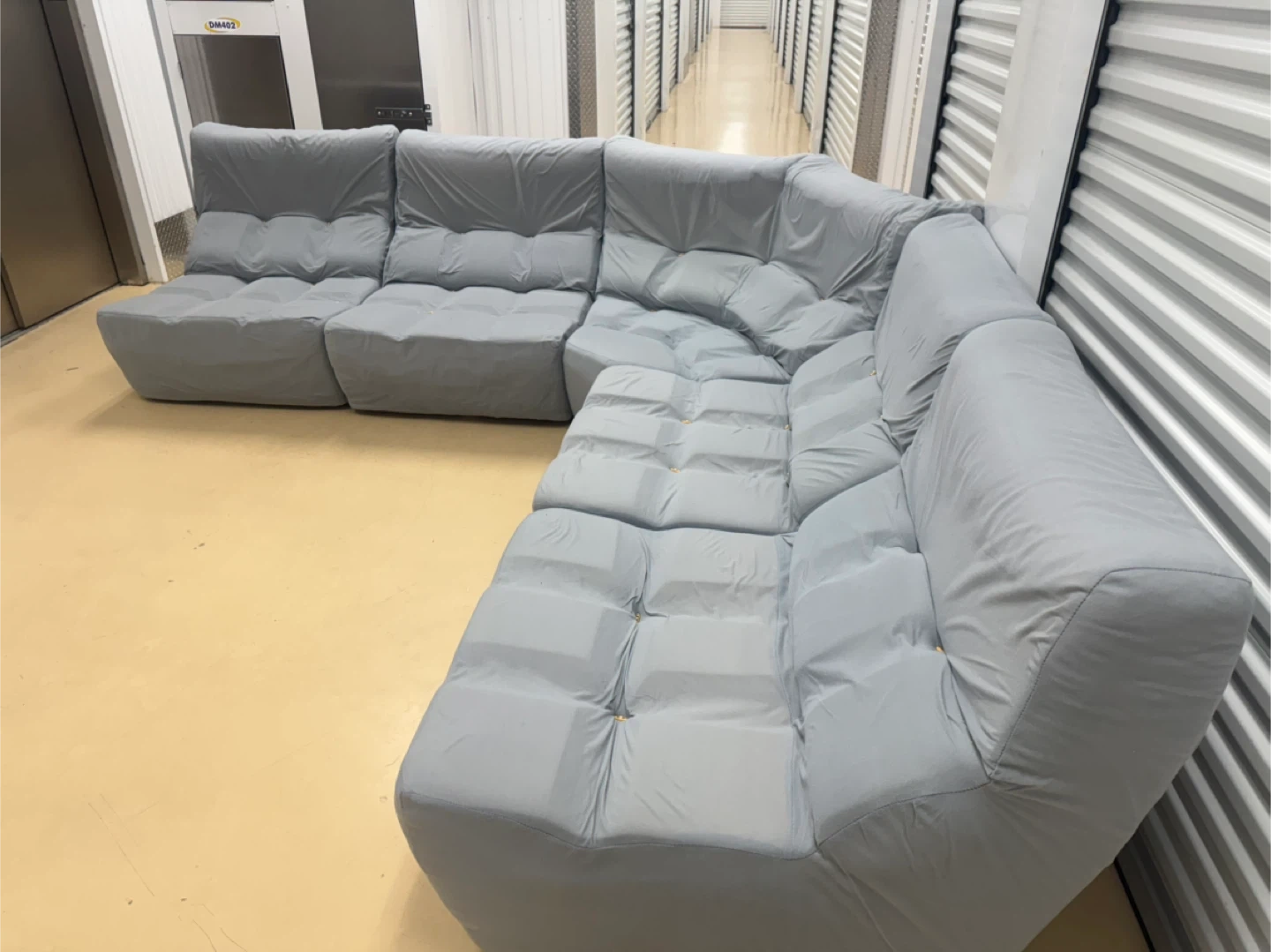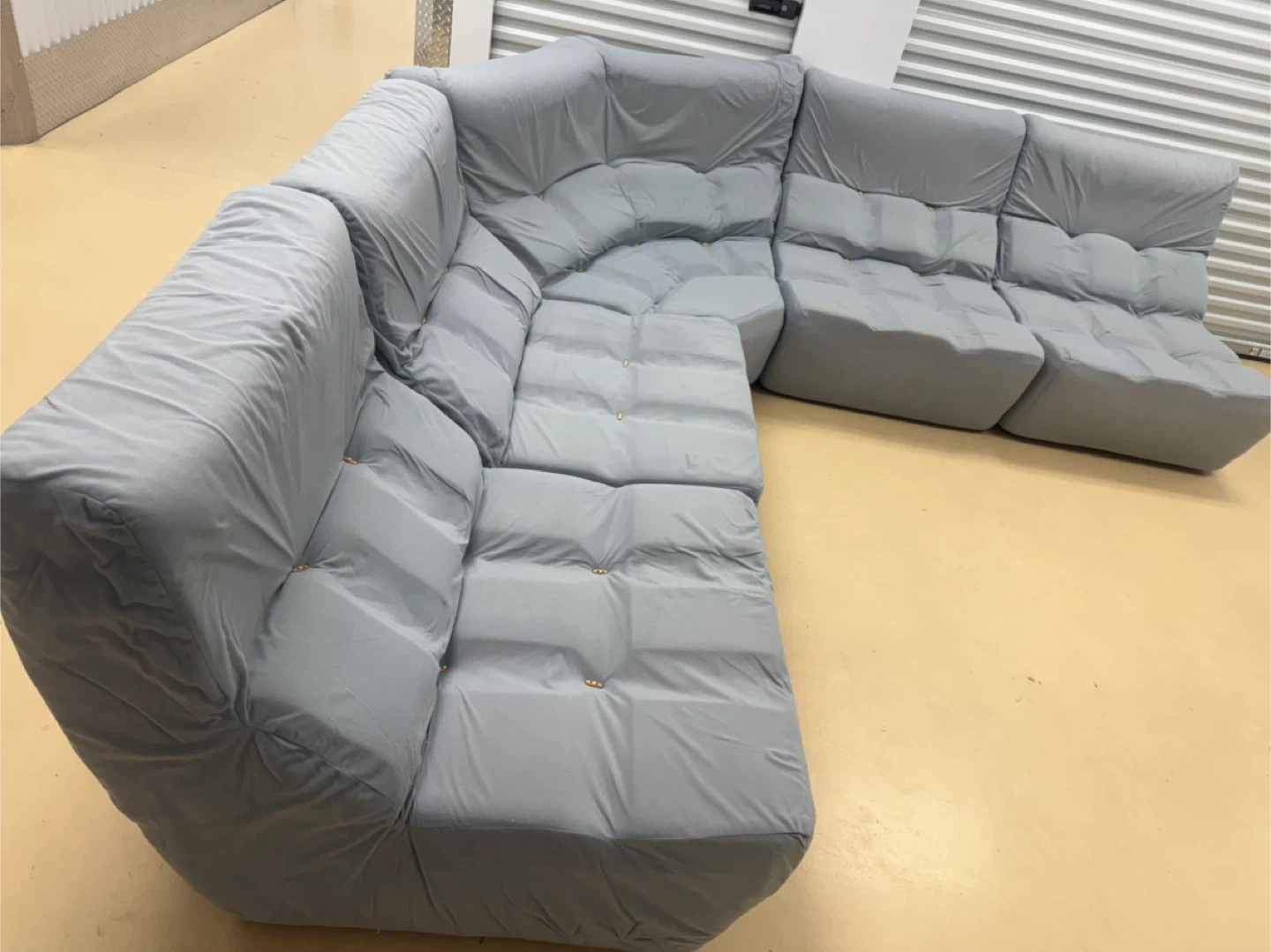 This is a grey sectional sofa with tufted cushions. It's made of fabric. It's a modular piece, great for configuring to fit your space! Good condition home delivery available